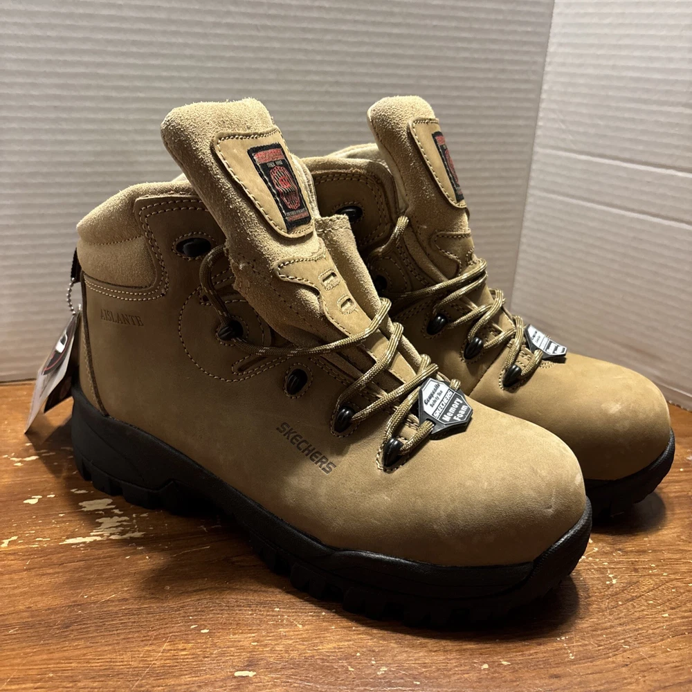 The product is a pair of SKECHERS men's work boots in size 8 with composite safety toe. They are khaki in color with a solid pattern, lace-up closure, and round toe shape. The boots feature air-cooled memory foam insoles for comfort, slip-resistant outsoles, and are oil resistant. They were manufactured in 2018 in China as part of the Skechers Memory Foam product line. Perfect for workwear in all seasons. International charges are the buyer’s responsibility. No international returns.