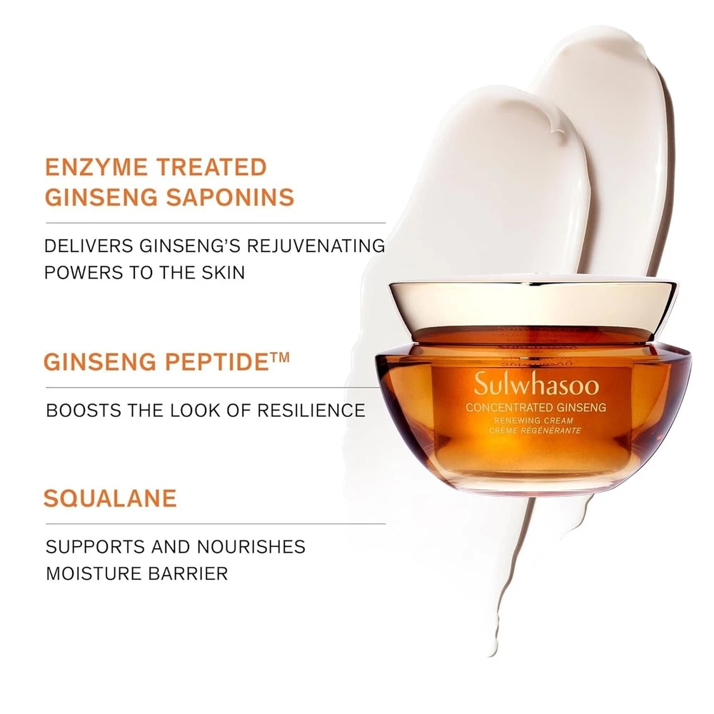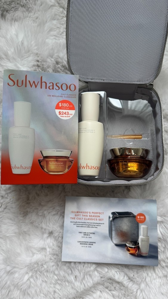 NEW SULWHASOO Holiday Cult Classics Ginseng Serum And Cream Gift Set Korean This set helps boost moisture and visibly improves firmness, sagging skin, and fine lines and wrinkles. First Care Activating Serum VI 2.02 FL. OZ. / 60ML A first of its kind activating serum designed to fortify your moisture barrier post- cleanse to aid in better absorption of products that follow. Immediately after use, it helps improve skin’s water and oil balance while providing lasting hydration. Within four weeks, this serum helps address 10 signs of visible aging.* *Based on an 8-week clinical study on 30 women 39 to 60 Concentrated Ginseng Renewing Cream 1.01 FL. OZ. / 30 ML Description Skin Type: Combination, Dry, Normal, Oily Skin Concerns: Ageing, Dryness, Fine Lines & Wrinkles, Firmness & Elasticity, Uneven Skin Texture Formulation: Cream Skincare By Age: 20s, 30s, 40s, 50+, Under 20 What it is: An anti-ageing cream with soft cream texture that cares for comprehensive signs of ageing for healthier-looking skin. What it does: This powerful anti-ageing cream sustains triple resilience-boosting efficacies of Sulwhasoo's unique GINSENOMICS™ to replenish, support, and help strengthen skin day after day to reveal ageless skin. With a unique texture that feels soft upon application and melts into skin, not only is this cream an anti-ageing masterpiece, but it’s also a sensorial experience. GINSENOMICS™ is a powerful, active beauty Ginsenoside developed by Sulwhasoo to help minimise visible signs of aging. Sulwhasoo enriches the rarest type of Ginseng Saponin more than 6,000 times to produce GINSENOMICS™. It enhances your skin’s ability to regenerate and keep it looking firm and resilient against any external aggressors, helping to reduce wrinkles that have appeared on your skin. Ingredients Product Claims: Anti-oxidants, Oil-free, Paraben-free, Peptides, Sulphate-free, Vitamins