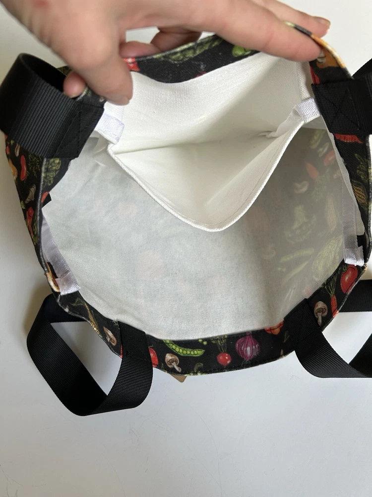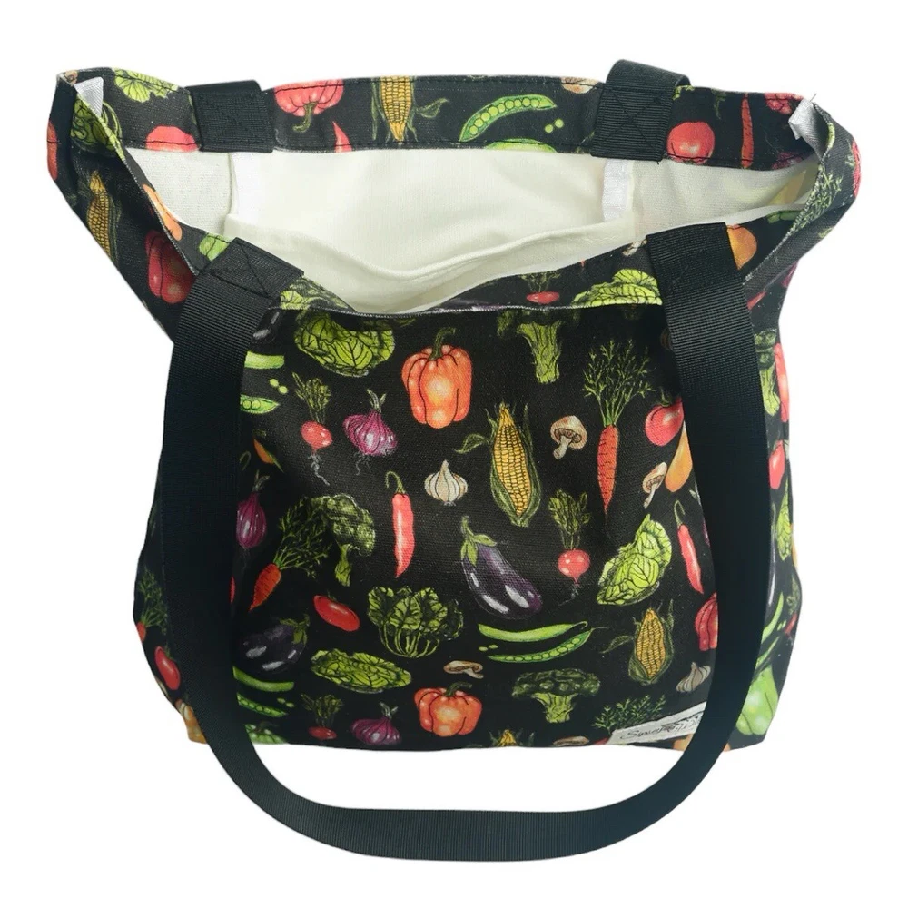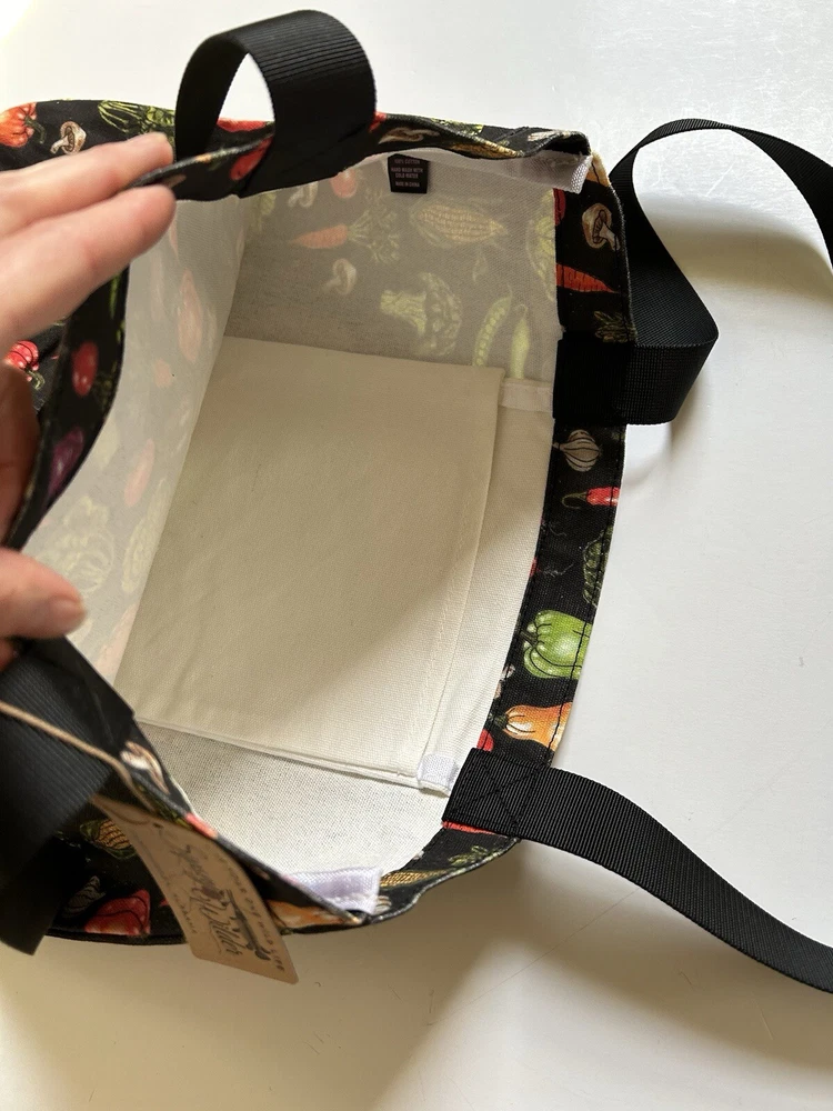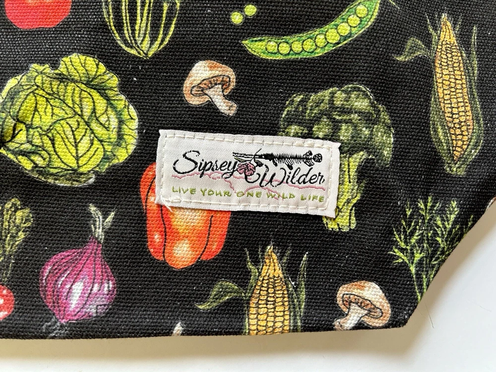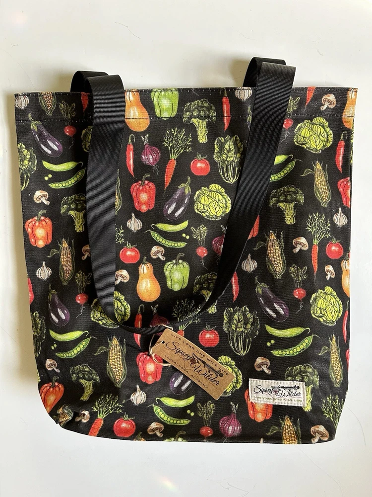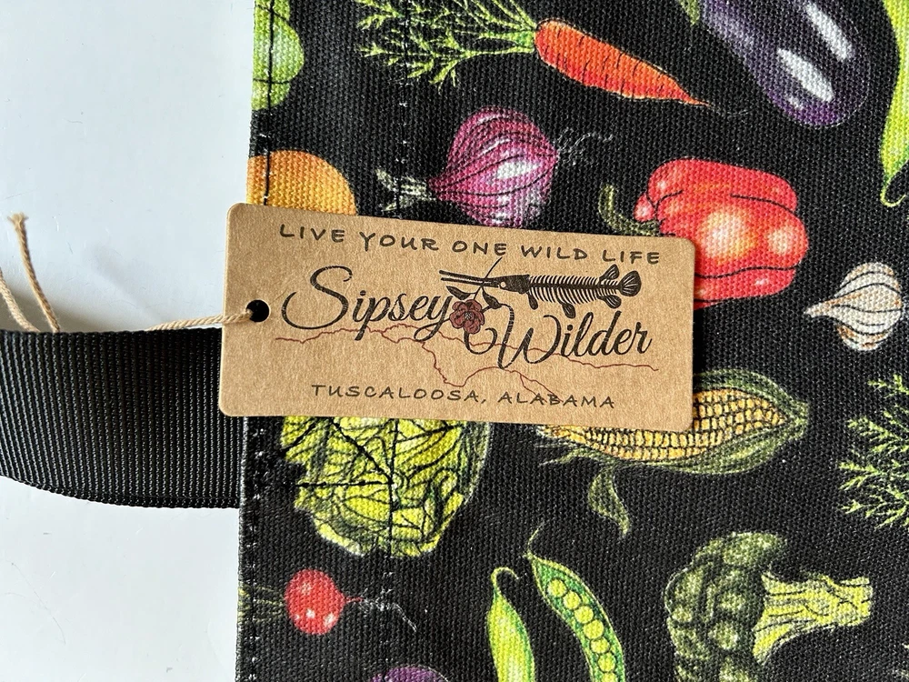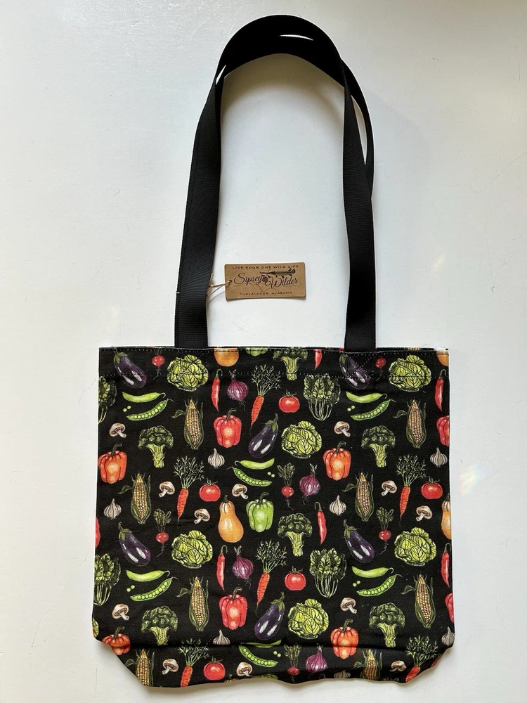 This fantastic tote bag from Sipsey Wilder—a woman-owned, eco-conscious small business from Tuscaloosa, Alabama—is in perfect, brand new condition, with tags. It features adorable “Fresh Veggies” artwork in bright colors over a black background. I love the overall effect of all this produce over black! I also love how sturdy and spacious this bag is! It’s seriously roomy and capable of holding a LOT of stuff! Tote measures 15"H x 15"W x 4"D Double handles Handle drop measures 13 in Limited Edition. From Sipsey Wilder: A healthy harvest of bright and delicious vegetables pop on a black background. Commit to plastic-free shopping! Adorable reusable shopping bags in eye-catching prints! Includes gusseted structure and an inner pocket for your personal items! Measures 15" x 15" x 4" with a 13" drop strap Includes open pocket inside for personal items or small items. Gusseted structure Cotton Canvas