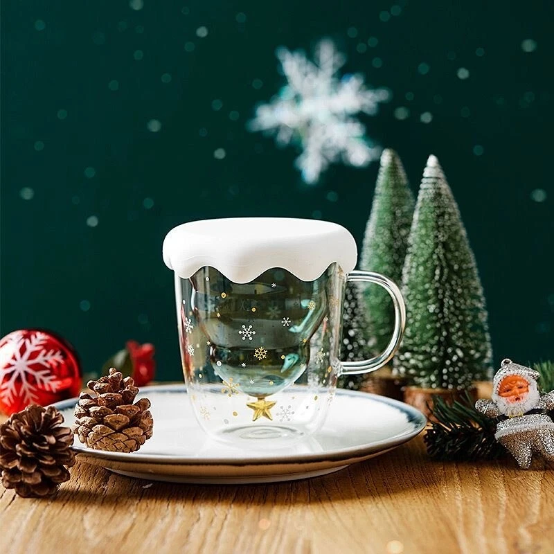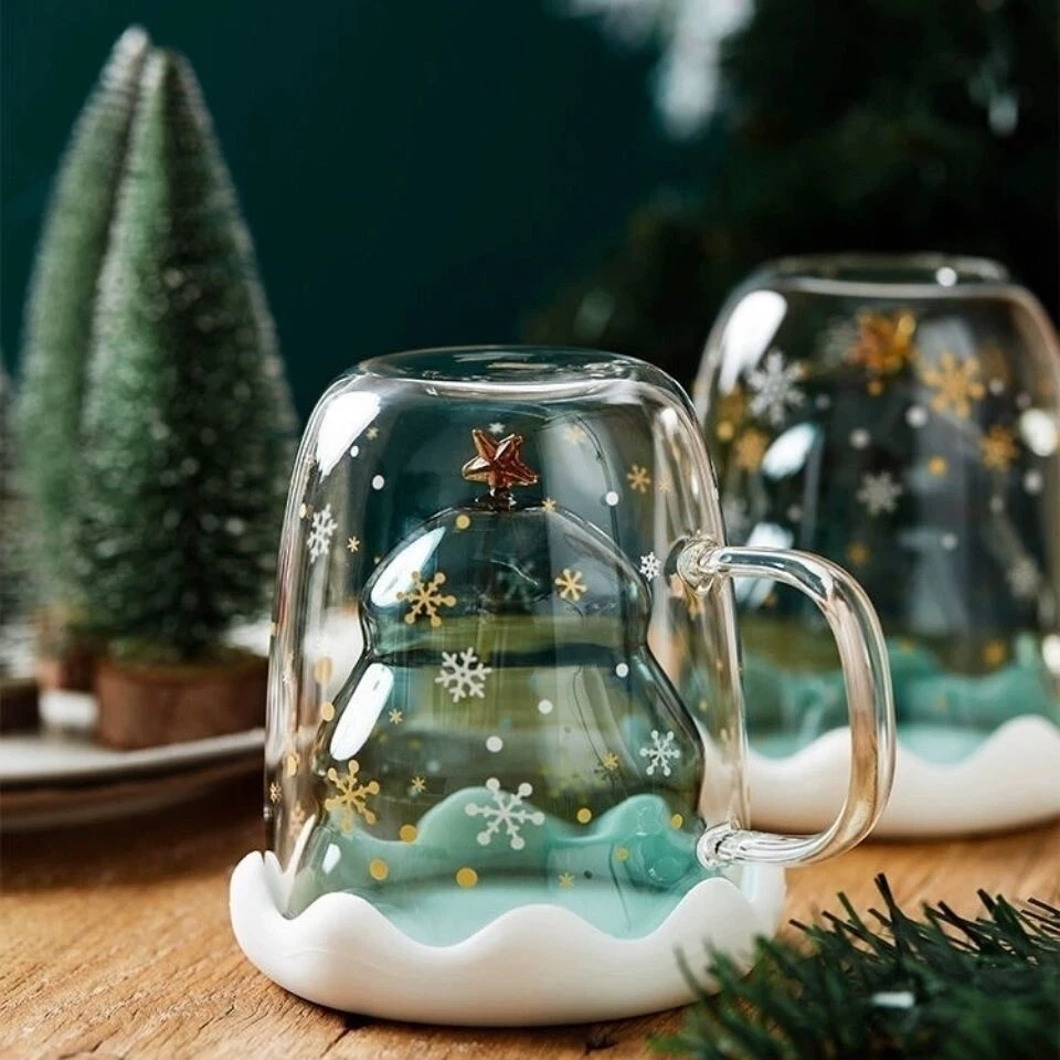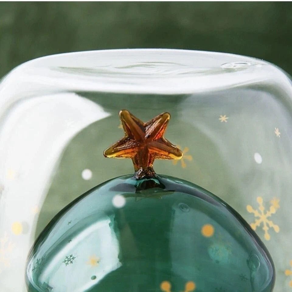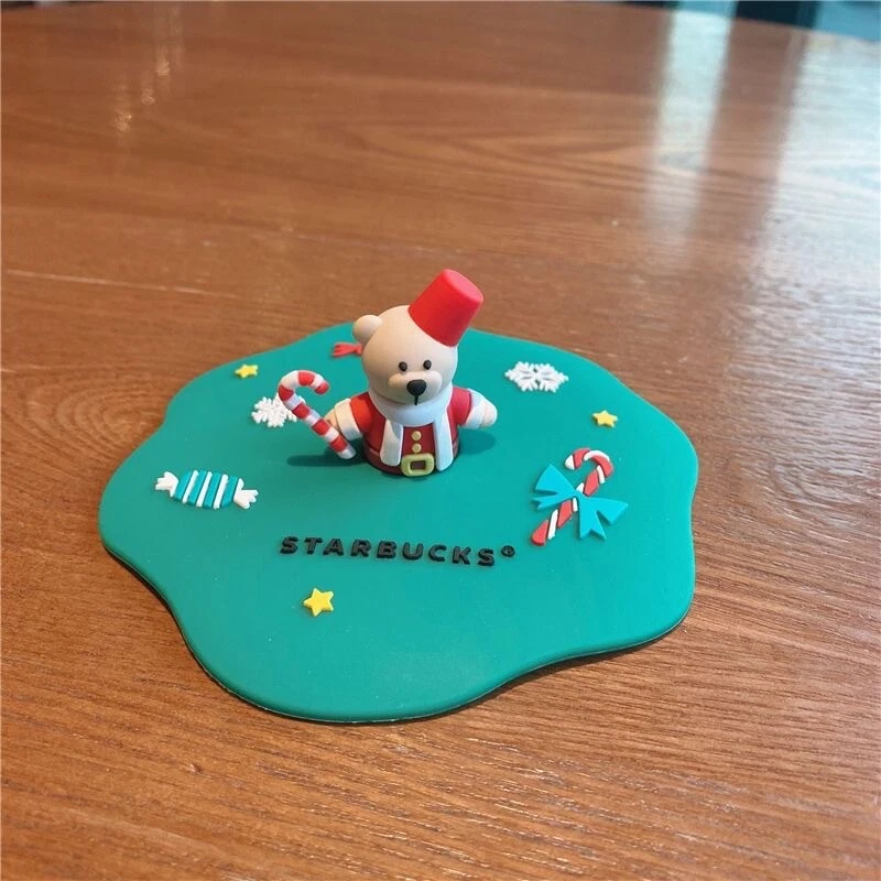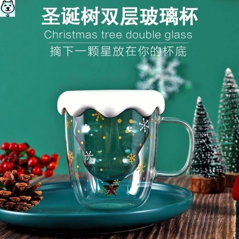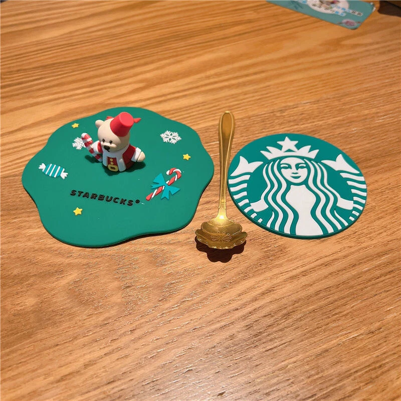 NEW Starbucks Bear Silicone Lid Christmas Tree Double Glass Spoon Coffee Mug Cup