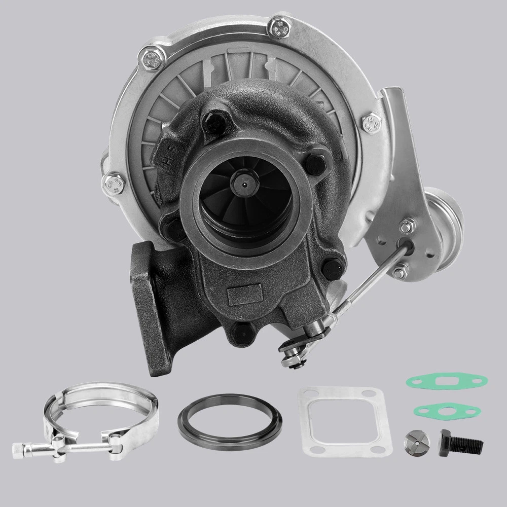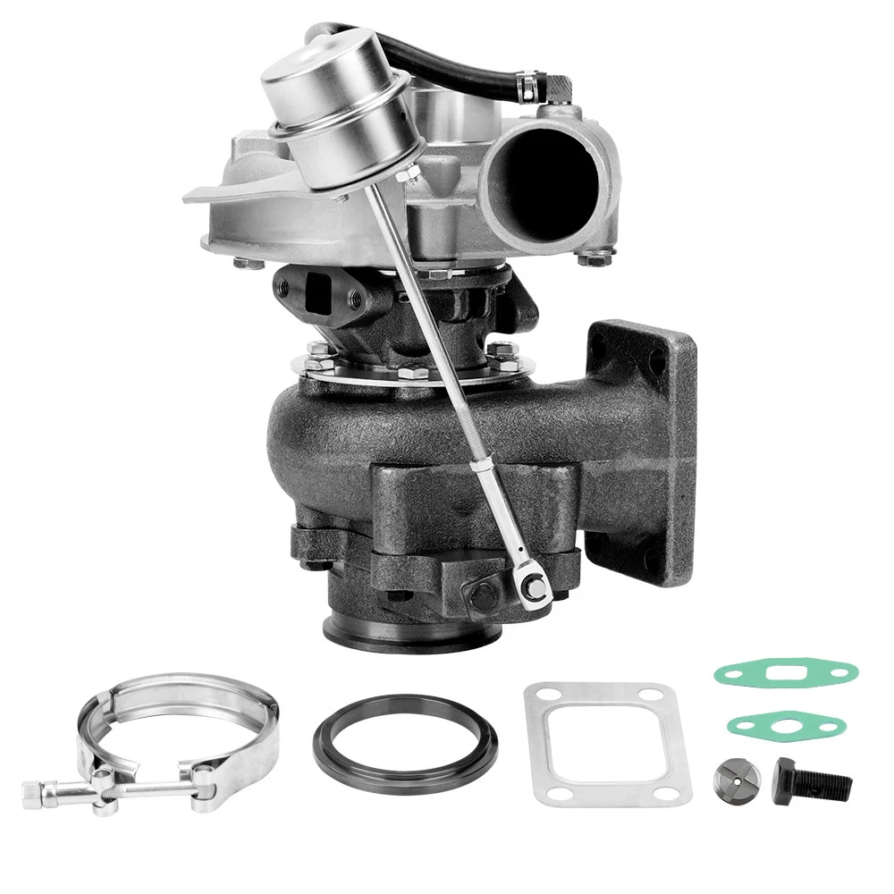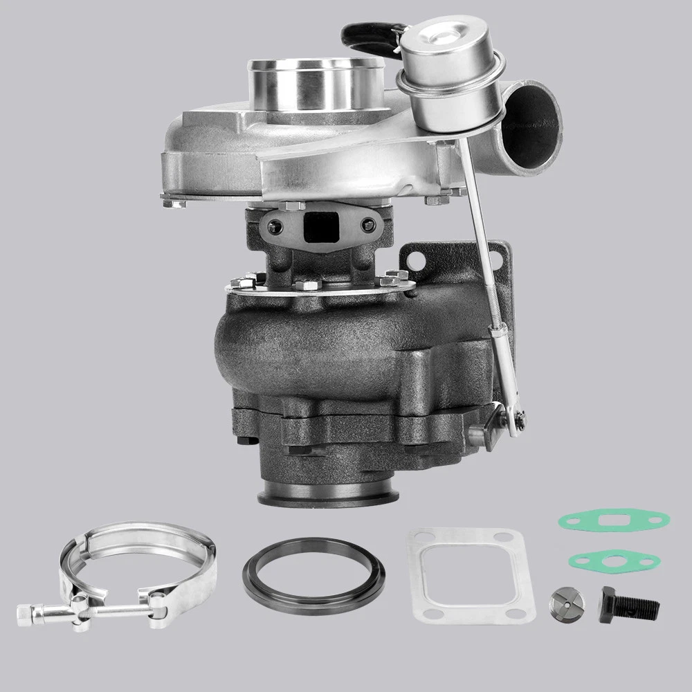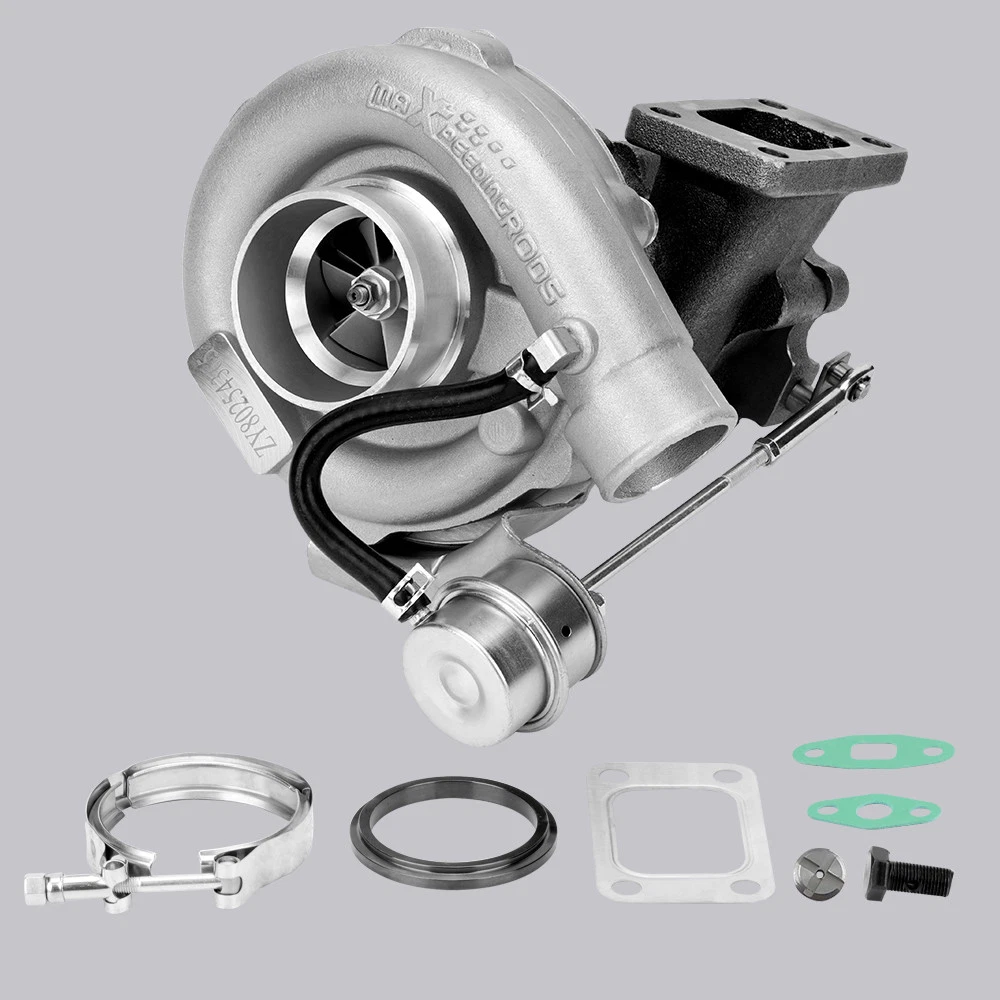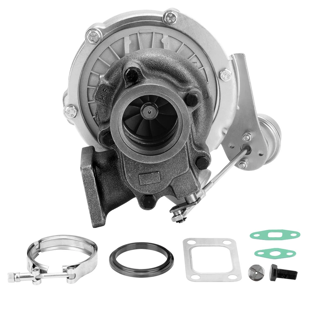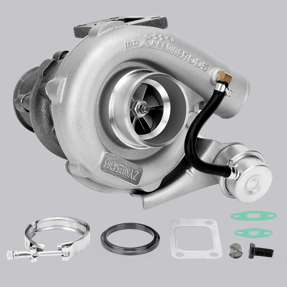 Universal T3 T04E V-band Turbocharger .63 A/R W/ Wastegate Application: Perfect for all 4 or 6 CYL, 1.5L-2.5L Engines *Notice:Please confirm that there is enough space in your car to install this turbo before purchasing. Product Specific: Exhaust Inlet (Turbo Manifold) Flange: T3 4 bolt Flange Patterns Exhaust Outlet Flange: V-Band Flange (ID/OD: 2.5"/3.1") Turbine Side: Turbine Trim: 74.2 Turbine A/R: 0.63 Turbine Inducer: 64.8mm Turbine Exducer: 55.8mm Turbine exhaust outlet : 79mm Turbine exhaust inlet: 44.7mm (length) / 85.8mm (width) Compressor Side: Compressor Trim: 48.1 Compressor A/R: 0.5 Compressor Inducer: 52.7mm Compressor Exducer: 76mm Compressor outlet:78 mm Compressor inlet:51.5 mm Oil Inlet: M12*1.25 & 2*M8*1.25 Oil Outlet: 2*M8*1.25 Bearing: Journal Bearing Cooling Type: Oil Cooled Wastegate: w/ Wastegate Thrust Bearings: 270 Degrees Hosepower: Up to 420 HP Turbo Type: Individual Condition: 100% Brand New Accessories: You will get exactly as shown as picture above Package Size: 30x 28x 24 cm Package Weight: 9180g Features: *Product Material 1. Turbine housing: Ductile iron QT450-10 - temperature resistant up to 700℃ 2. Steel turbine wheel: K418 alloy - high oxidation stability and resistance up to 900℃ 3. Compressor housing: ZL104 aluminum with lightweight 4. Compressor wheel: Cast aluminium blades – superior air tightness & corrosion resistance *Product Features 1. Rich experience in turbo production and own factory 2. High-Speed oil seal ring and Precision clearance 3. Built for durability and strength * Technology Advantage: 1. 100% balancing Test by TURBOTECHNICS VSR3 2. G3-min-Flow VNT Turbo testing 3. Advanced Actuator Tester/Programmer Note: * Replace, repair or reconnect air cleaner element per manufacturer's manual to avoid compressor wheel damage. * Make sure the oil drain line is lower than the turbo itself. * Ensure exhaust outlet are well sealed by welding * The degree of modification of the universal turbo depends on your individual vehicle.Professional installation is highly recommended. * This Turbo is not vehicle specific. Please check the specifications and verify compatibility prior to placing your order. * Before installing the new turbocharger, the cause that led to the failure of the turbo must be analyzed and eliminated (e.g. insufficient oil supply, foreign bodies in the intake area, crankcase ventilation without function, etc.)! MXR04FXJT
