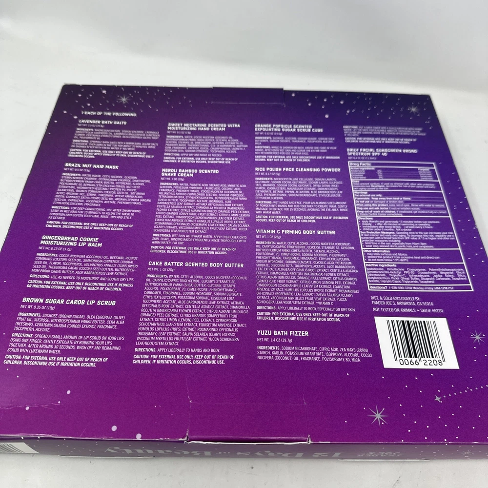 Department:UnisexSet Includes:Cleanser, Exfoliant, Lip Balm, Lip TreatmentBrand:Trader Joe'sBody Area:Arm, Face, Full Body, Hand, LipsCountry/Region of Manufacture:United Statesgtin13:Does not applySkin Type:All Skin TypesType:12 Days of BeautyUPC:Does not apply