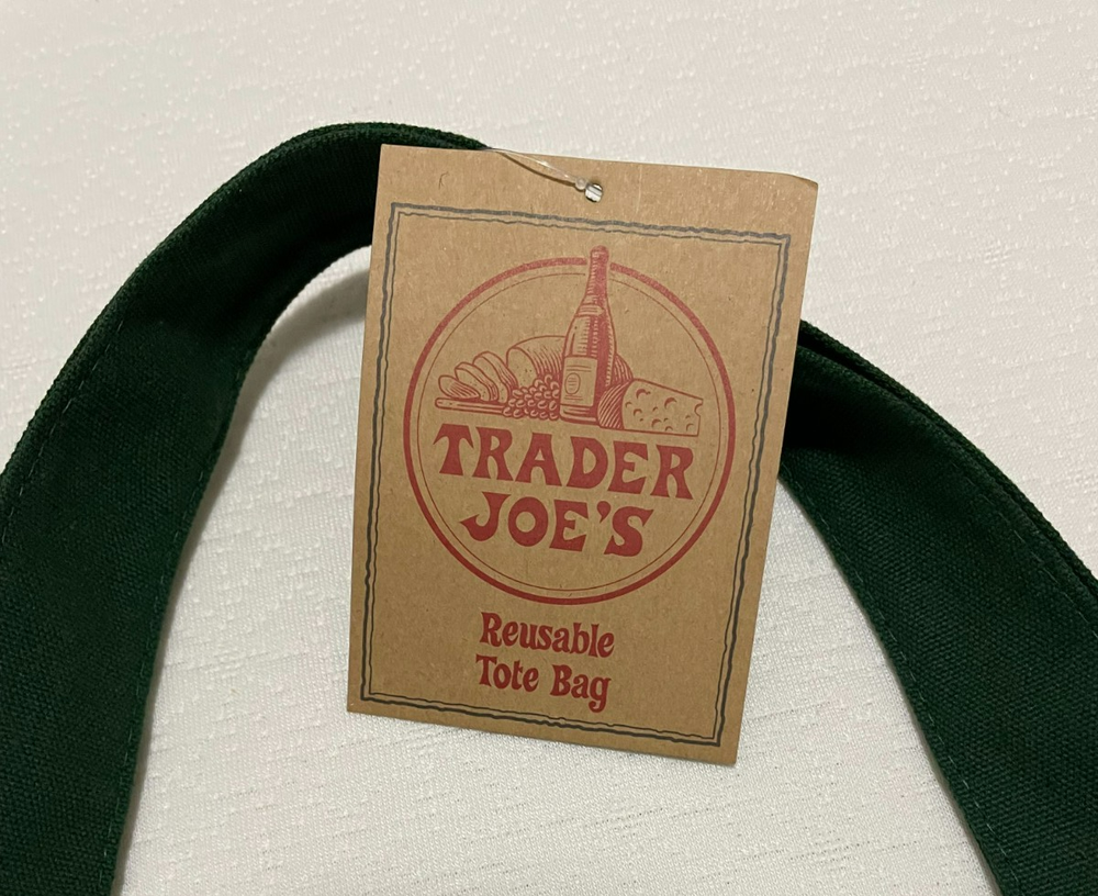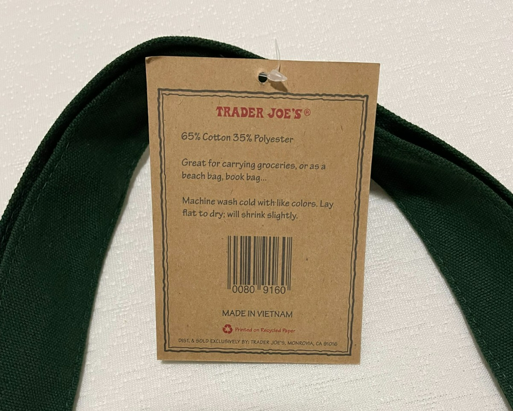Care Instructions:Machine wash cold with like colors. Lay flat to dry; will shrinkCountry of Origin:VietnamMaterial:CanvasItem Height:14 inColor:GreenNumber in Pack:1Style:TraditionalItem Length:20 inItem Width:6 inMPN:00773836, 00809160Features:Foldable, Side PocketsOriginal/Reproduction:OriginalPersonalize:NoModel:Reusable Tote BagPattern:SolidSize:LargeBrand:Trader Joe'sType:Tote