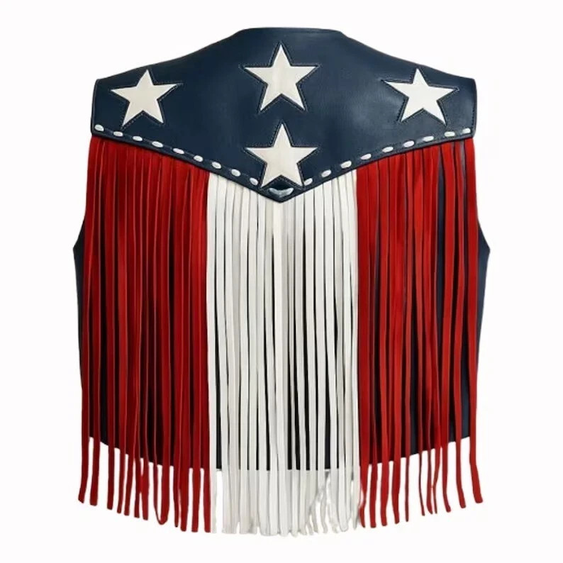 Comes as Pictured. This NEW USA Flag Leather Fringe Vest is a stylish and versatile piece perfect for a variety of occasions. Made from leather with fringe accents, this vest features a mid-length design suitable for all seasons. The biker style and Western theme make it a unique choice for those seeking a rugged yet fashionable look. With a personalized touch and available in sizes XXS to 8XL, this vest is designed to fit any individual's style and preferences. Perfect for travel, parties, or casual wear, this vest is a must-have for any wardrobe.
