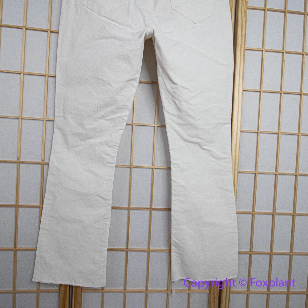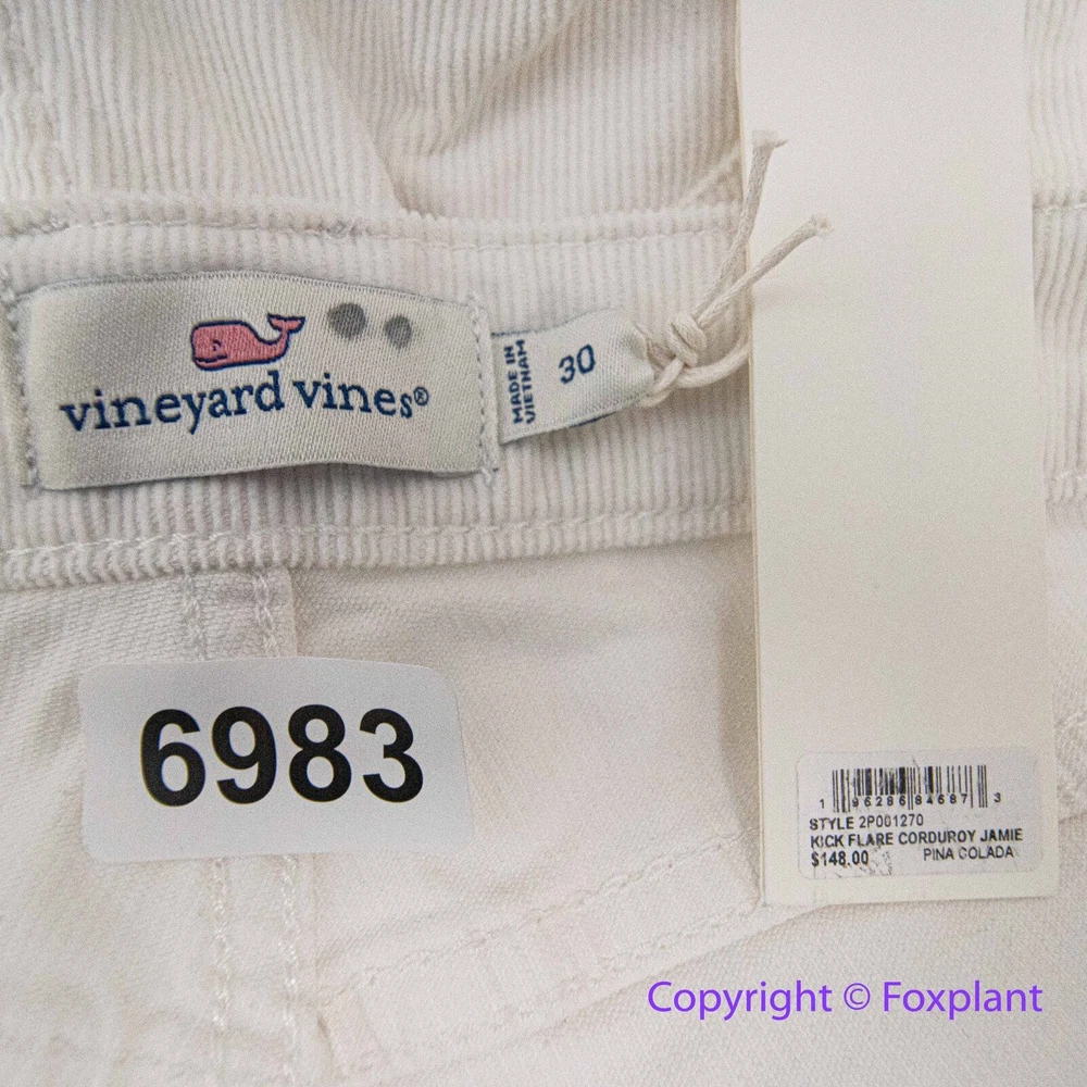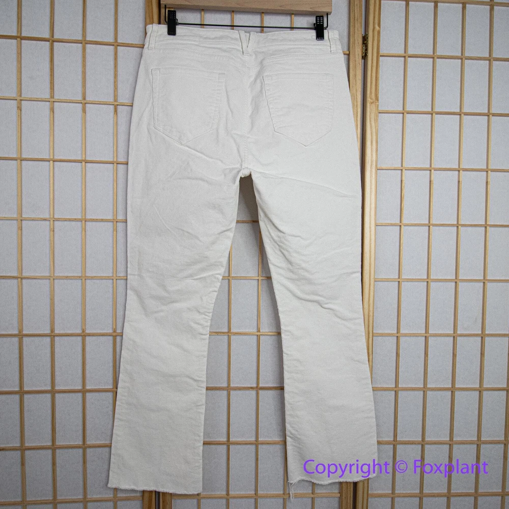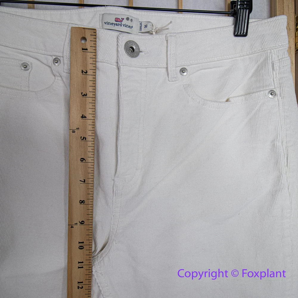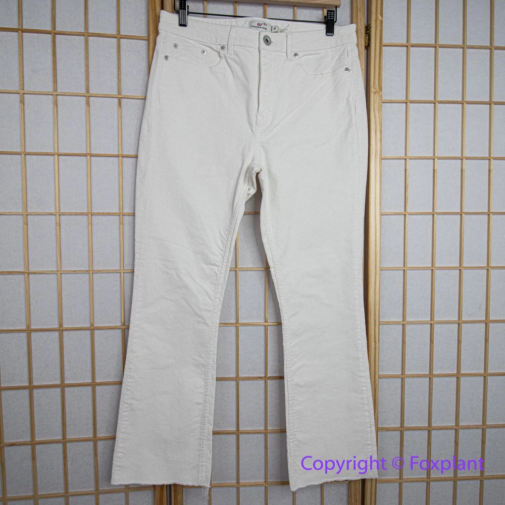 NEW Vineyard Vines high rise Pants Jeans Cotton Kick Flare Corduroy Pina Colada, 30 Please note: New with tags, some marks as shown. Zip fly with button closure Belt loops Five-pocket style Silver-tone hardware Corduroy fabrication Flared-leg silhouette, high rise Raw-edge, frayed hem Imported 75% cotton/23% viscose/2% spandex Machine wash The measurements shown are approximate and are provided as a helpful reference, but not a guarantee of fit. Sometimes inseam measuring from the crotch to the hem with a yardstick may yield a slightly different result compared to using a soft tape measure along the seam. The actual colors may vary due to differences in lighting conditions and computer monitor settings.