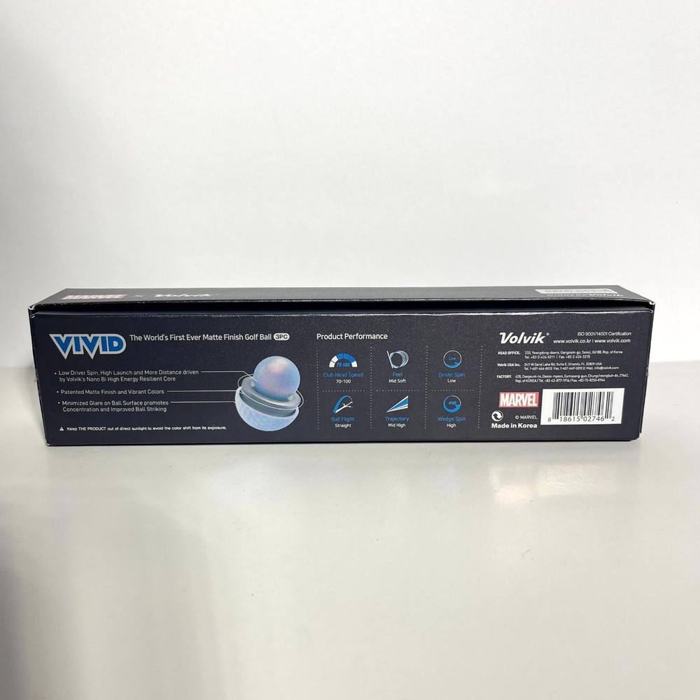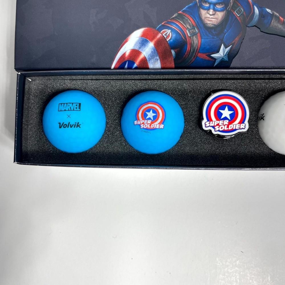 NEW Volvic Golf Ball Marker Marvel Gift Pack 2.0 (Captain America), 4 Balls and Marker Set Limited edition Volvik and Marvel collaboration golf balls with a marker set. The popular Captain America pressure ball is a great gift! Great for yourself, or as a prize for golf competitions or as a gift for someone you love. Golf balls are the world's first matte colour ball Volvik VIVID that stops and looks good.