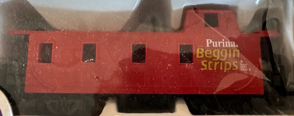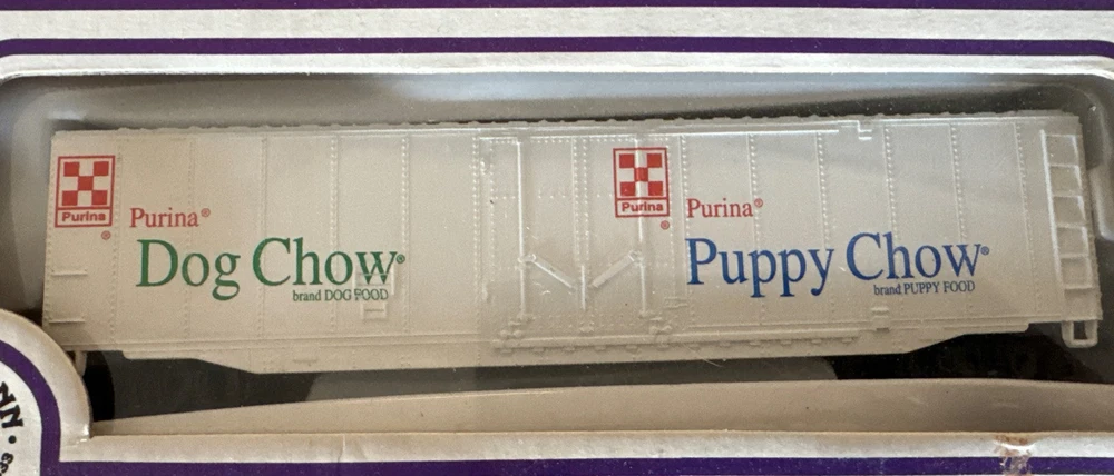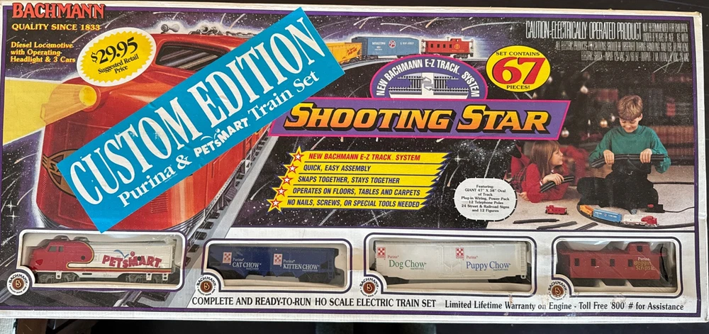 This is a vintage Bachmann Custom Edition Purina Petsmart Shooting Star HO Scale EZ Train set. The set includes 67 pieces, such as a box car, caboose, electric locomotive, railcar, track, and a stand. The set features tracks, limited edition, advertising specimen, with stand, sound function, painted, and unassembled kit. The set is made of tin, plastic, and diecast materials. The set is multicolored and has a Santa Fe Southern Railway corporate roadname. The set is analog and has a California Prop 65 warning. The set is grade C-9 Factory New-Brand New.
