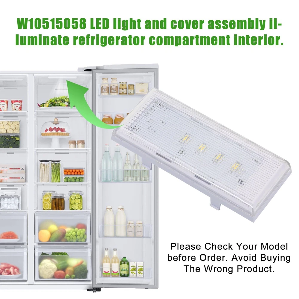 This part compatible with Whirlpool,Kenmore,Maytag,Ikea,Kitchenaid. Replacing Part Number: 8MSF25N4BW00,MSF21D4MDH01,MSF21D4MDH00,WRS325FDAB06,WRS325FDAB05,MSF25D4MDH02,WRS325FDAB04,10651729410,WRS342FIAW02,10641129211,10641129212,10651129212,10651129211,10641129210,10651129210,8MSF25N4BW02,WRS342FIAW00,WRS331FDDM01,WRS335FDDB00,WRS331FDDM00,10641129213,WRS335FDDB02,WRS335FDDB01,MSB27C2XAM00,WRS325FNAH00,10651135610,WRS325FNAH01,MSF25D4XAW00,WRS342FIAB00,MSF22D4XAW00,WRS342FIAB02,MSF22D4XAW0 Fits the following models (not all applicable models may be listed): 10651122211, 10651123211 , 10651124211 ,10651129211 , 10651129212 ,10651799412 , 10641122210 ,10641122211 , 7WRS22FDBF00 , 7WRS22FDBF02 , 7WRS22FDBW00 , 7WRS22FDBW02 Refrigerator. Part Number:WPW10515058 replaces these: WPW10515058, W10465957, W10515058, W10522611, WPW10515058VP, PS11755867, AP6022534, 3021142 .(No plastic case, only PCD board) IMPORTANT; Before Purchasing this item, you must check the other two led lights in the refrigerator. One is located in the mid section of the cooler side, the other one is located in the freezer side. If any of these lid lights are bad they must be replaced before the new main board installed . if these led lights are bad it will cause the main board to burn shortly after installation This part works with the following brands: Whirlpool, Kenmore, Maytag, KitchenAid. ,this listing is for the main led light located in the ceiling of the cooler side If you buy this led and still the leds do not work, that means you have short circuit with other two leds. You need to buy 2 pieces of W10515057 and replace all three to have working leds. If you have any questions, please login to your Amazon buyer account to leave us a message, we will solve you as soon as possible
