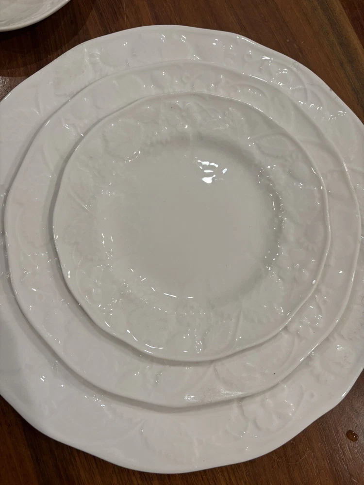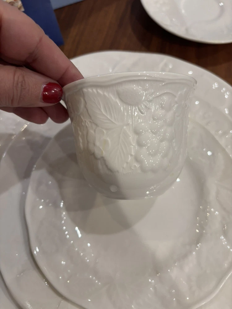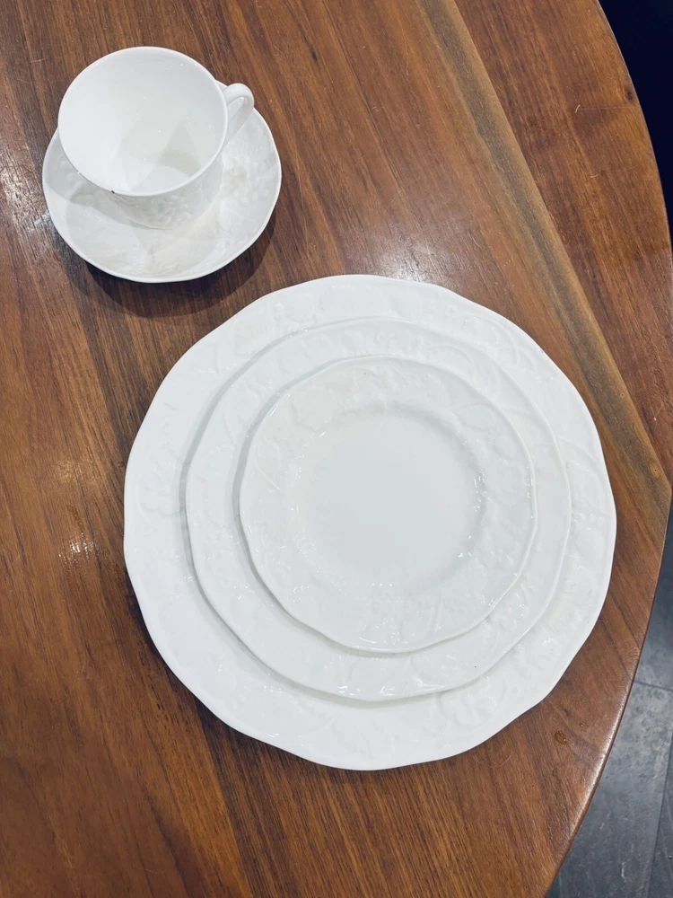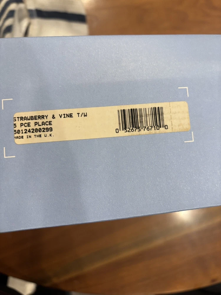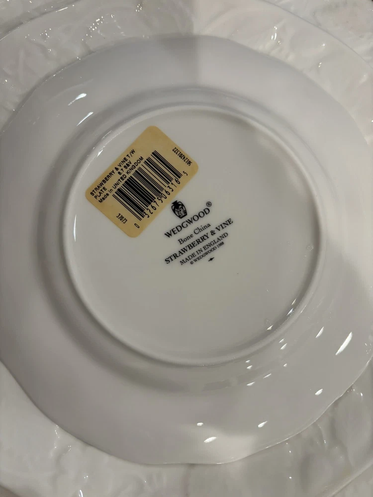 The product is a brand new Wedgwood "Strawberry And Vine" 5-piece place setting from England. The set includes a saucer, salad plate, dinner plate, bread plate, and cup, all made of white bone china with a printed Strawberry Vine backstamp. 8 sets of available. Price is per set.