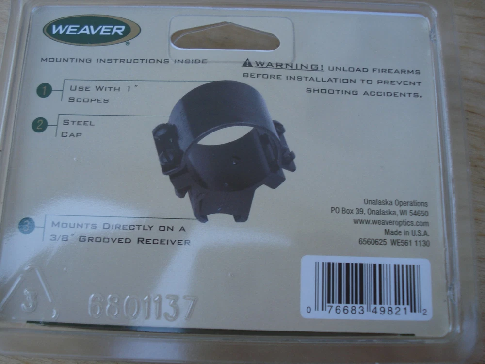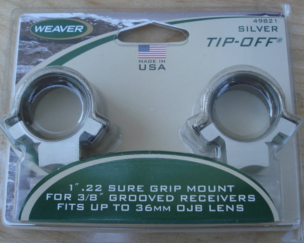 New, silver in color. Please verify application, according to company-- Weaver .22 Caliber Tip-Off Mount Rings 1" Sure Grip are made for .22s that have factory grooves in the rifle's receiver or tip-off base