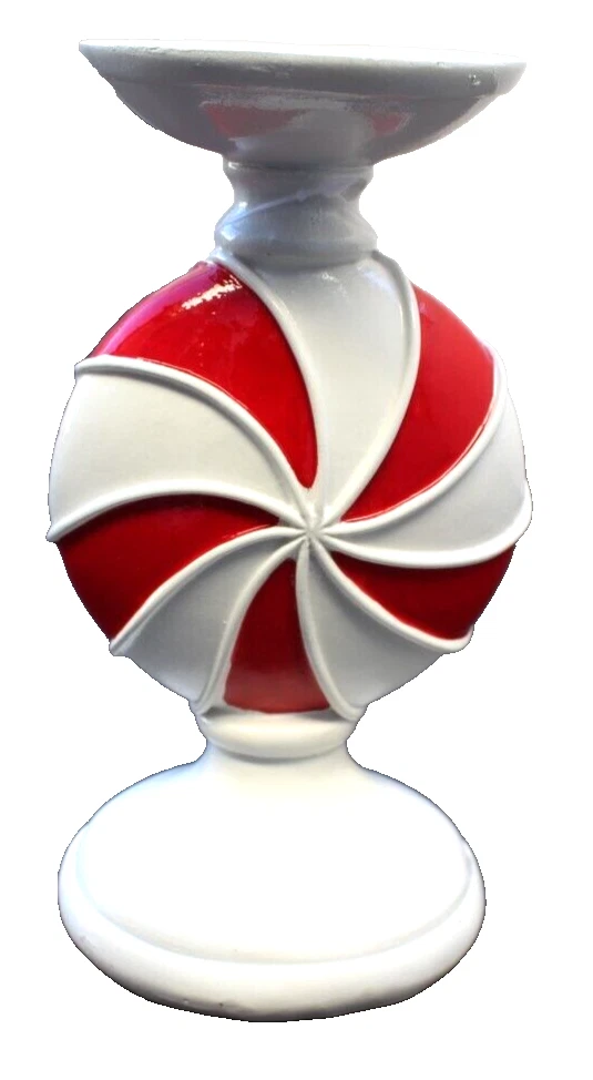 NEW White Red Christmas Peppermint Candy Cane Candle Holder Tabletop Decor Condition: New 8 1/2" Tall Add a festive touch to your home decor with this delightful White Red Christmas Peppermint Candy Cane Candle Holder. Perfect for tabletop display, this gingerbread-style holder is adorned with sparkling rhinestones, giving it a charming and festive appeal. Crafted from resin with a glossy finish, it's designed to complement any room, but is especially suited for the living room during the holiday season. The round, free-standing design ensures easy placement and the candle holder does not require any additional parts to function, making it both user-friendly and decorative. It's an ideal accessory for those who appreciate the Christmas and holiday themes, without the need for personalization or customization. Enhance your seasonal decorations with this enchanting piece that promises to be a delightful addition to your home. (Bin G15) SKU000700PH