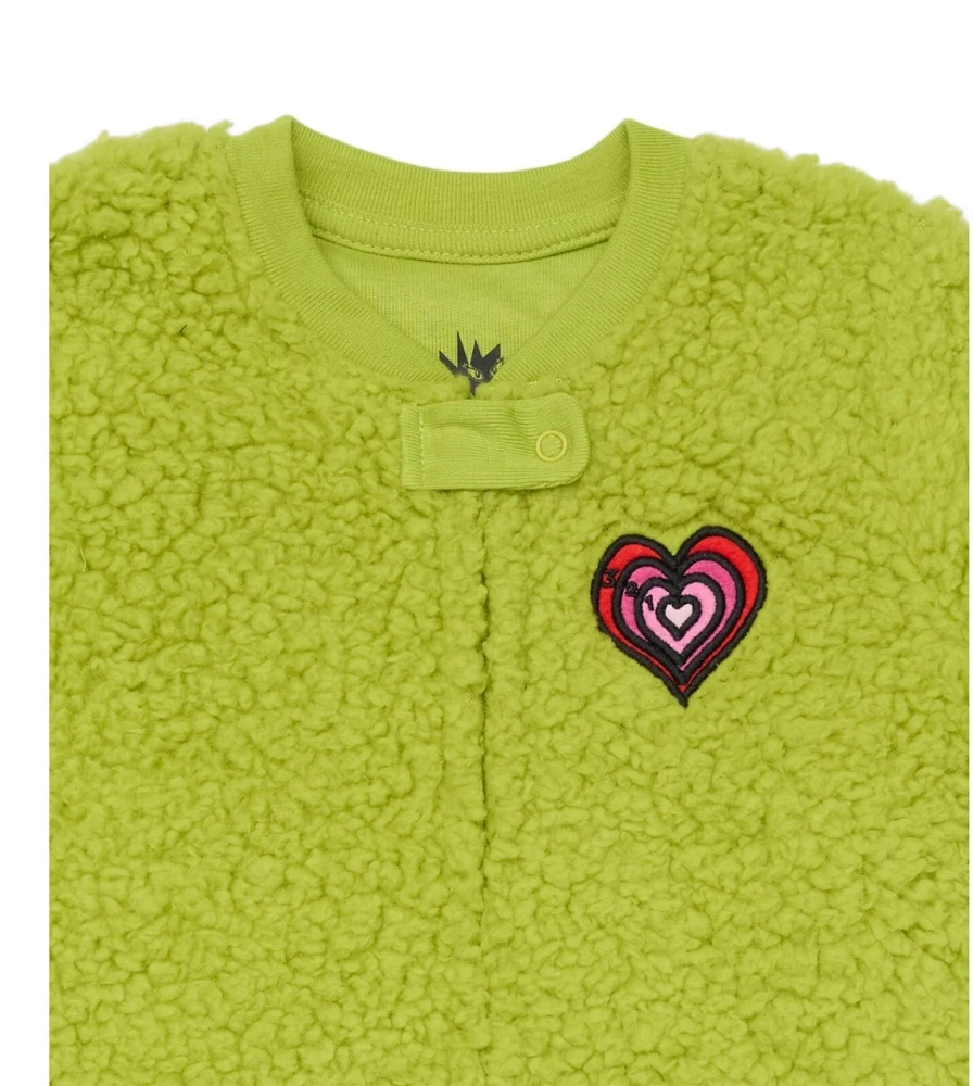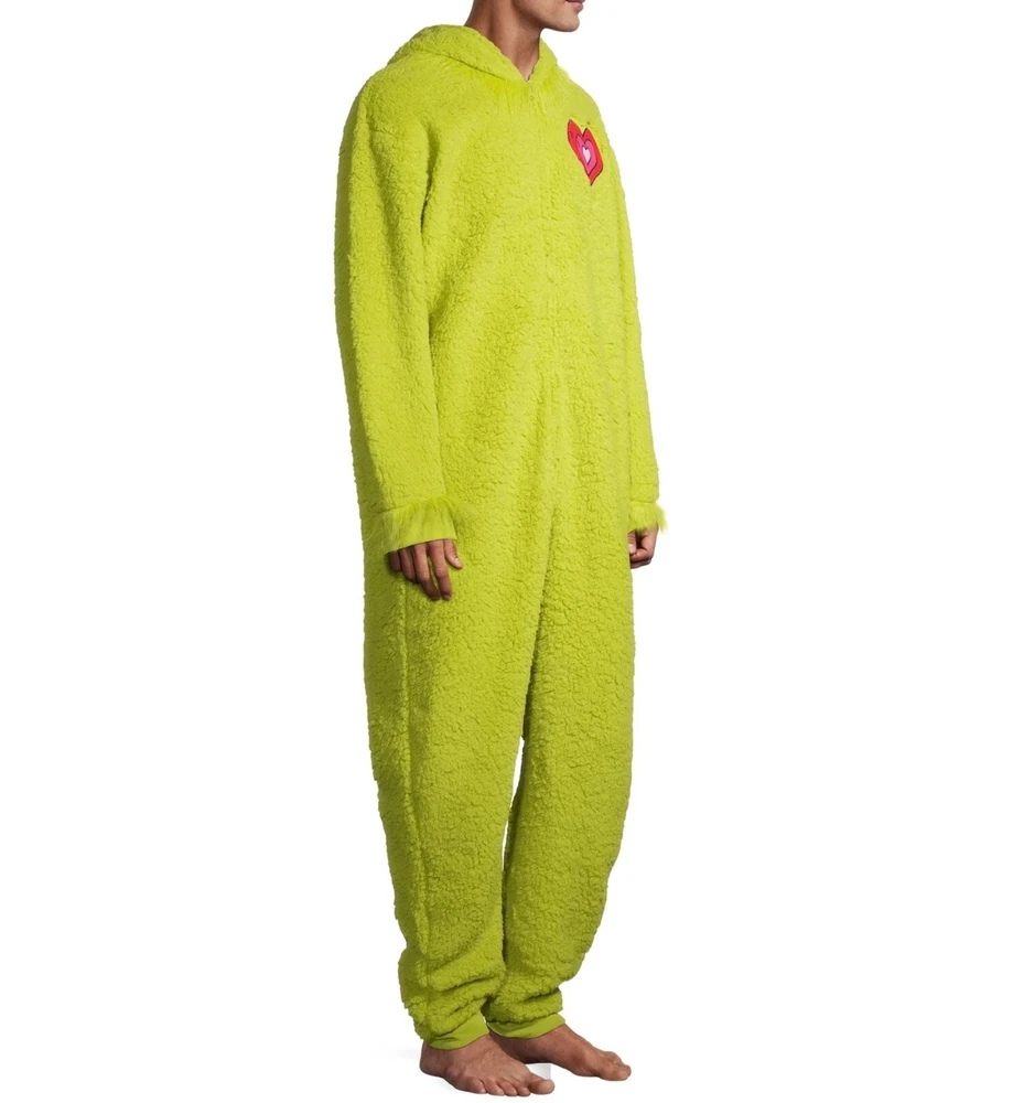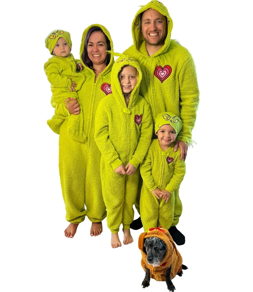 new family matching pajamas Material: 100% Polyester Care: Machine washable Country of Origin: Imported Fit: Relaxed Neckline: Crewneck; attached hood with tuft of faux fur on top Closure: Zip front; chin guard Sleeves: Long-sleeves with ribbed cuffs Features: Footed plush soft faux Shearling Copyright: © Seuss Enterprises, All Rights Reserved Dr.Seuss Unisex Kids The Grinch Christmas Matching Family Pajamas Union Suit baby and toddler do not have hood, they have a beanie
