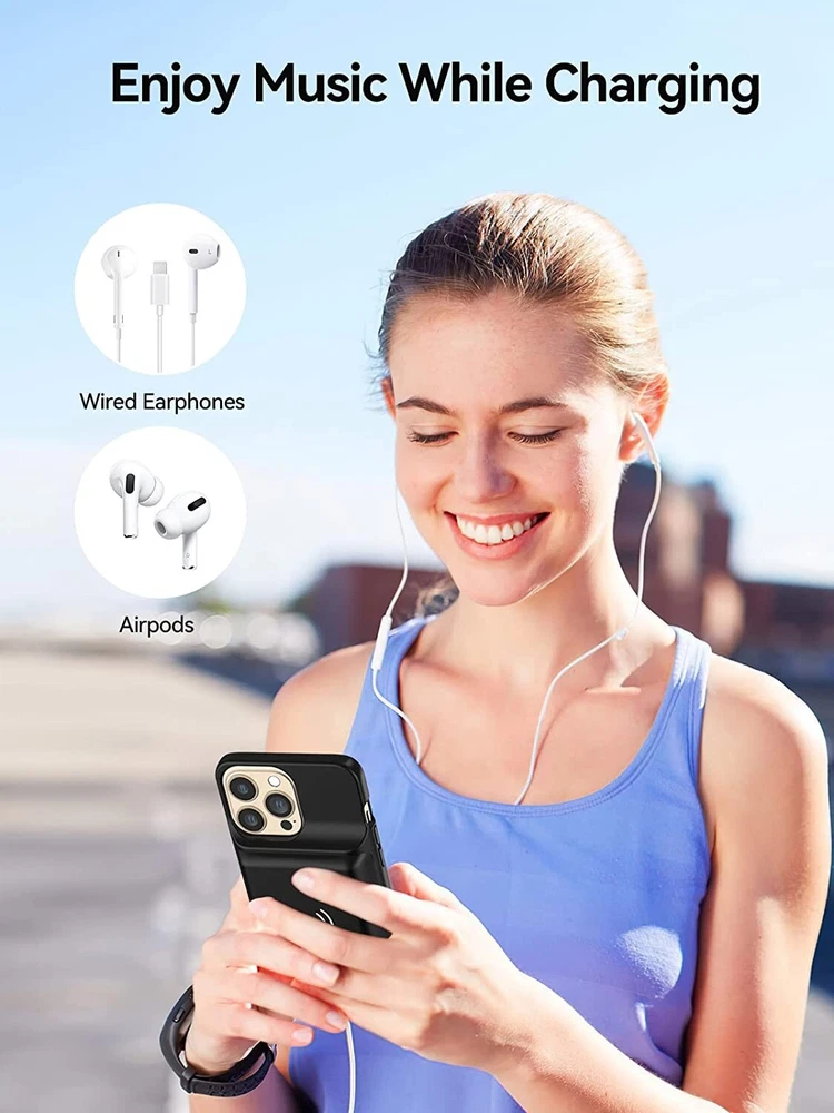 [Compatibility] This battery case only fits for iPhone 14 Pro, iPhone 14, iPhone 13 Pro, iPhone 13 6.1 inch. Doesn't fit for iPhone 14 Plus, iPhone 14 Pro Max, iPhone 13 Pro Max. Please check your phone model before buying. [10000mAh Powerful Capacity] The battery case for iPhone 14 Pro equipped with 10000mAh battery, extended 200% battery life to your phone. Let you get rid of the anxiety about battery electricity anytime, anywhere. [Advanced Wireless & Wired Charging] You can charge the charger case and for iPhone 14 simultaneously via Qi charging pad or original charging cable(not included), and phone will be recharged first. [Wired earphone & Sync-data & Apple Pay Supported] The charging case for iphone 13 Pro support wired& wireless earphone and Apple Pay function. You can conveniently transfer files to your Macbook, PC or laptop and don’t need to take the battery case off. Make your life more convenient. [Easy To Use & Smart Indicators] Bend the soft rubber top and slide your phone into the iphone 13 extended case charger, press the button for 3s to start / stop charging. Press the button for once to check the percent of charge available via the led indicators. [What You Will Get] 1* Battery case for iPhone 14 Pro/14 /13 Pro/13, 1* User manual, 24h professional and friendly support,If you have any problem with our product, we will be more than happy to assist. NEWDERY 10000mAh Portable Qi Wireless Charging Supported Rechargeable Battery Case for iPhone 14 Pro/14/13 Pro/13 6.1 inches 1. Designed for iPhone 14 Pro, iPhone 14, iPhone 13 pro, iPhone 13(6.1inch).(NOT for iPhone 14 Plus,iPhone 14 Pro Max,iPhone 13 Pro Max). 2. Built-in 10000mAh Li-ion battery, add 200% battery power to your phone. 3. Support wired earphone, Bluetooth earphone, no need to remove the battery case for iphone 14 pro when enjoying music, movie and video. 4. Qi wireless charging, sync data, Apple pay supported. NOTE: DOESN'T SUPPORT MAGNETIC charging. 5. Soft TPU material and sleek back up offers a great grip experience. 6.This battery case is compatible with carplay via Bluetooth and usb to iPhone cable. 7.Please use USB A to ios charging cable to sync data. 8. Doesn't support fast charger. Please use a 5V/1.5A adapter to charge the case. Easy to Use 1. Bend the soft part of the charging case for iphone 14 pro. 2. Slide your phone into the battery case for iPhone 13, lining up the connector of your phone with the connector of the charger case. 3. Press the button for 3s to begin/stop charging your phone. 4. One-Click the power button to know the power level.