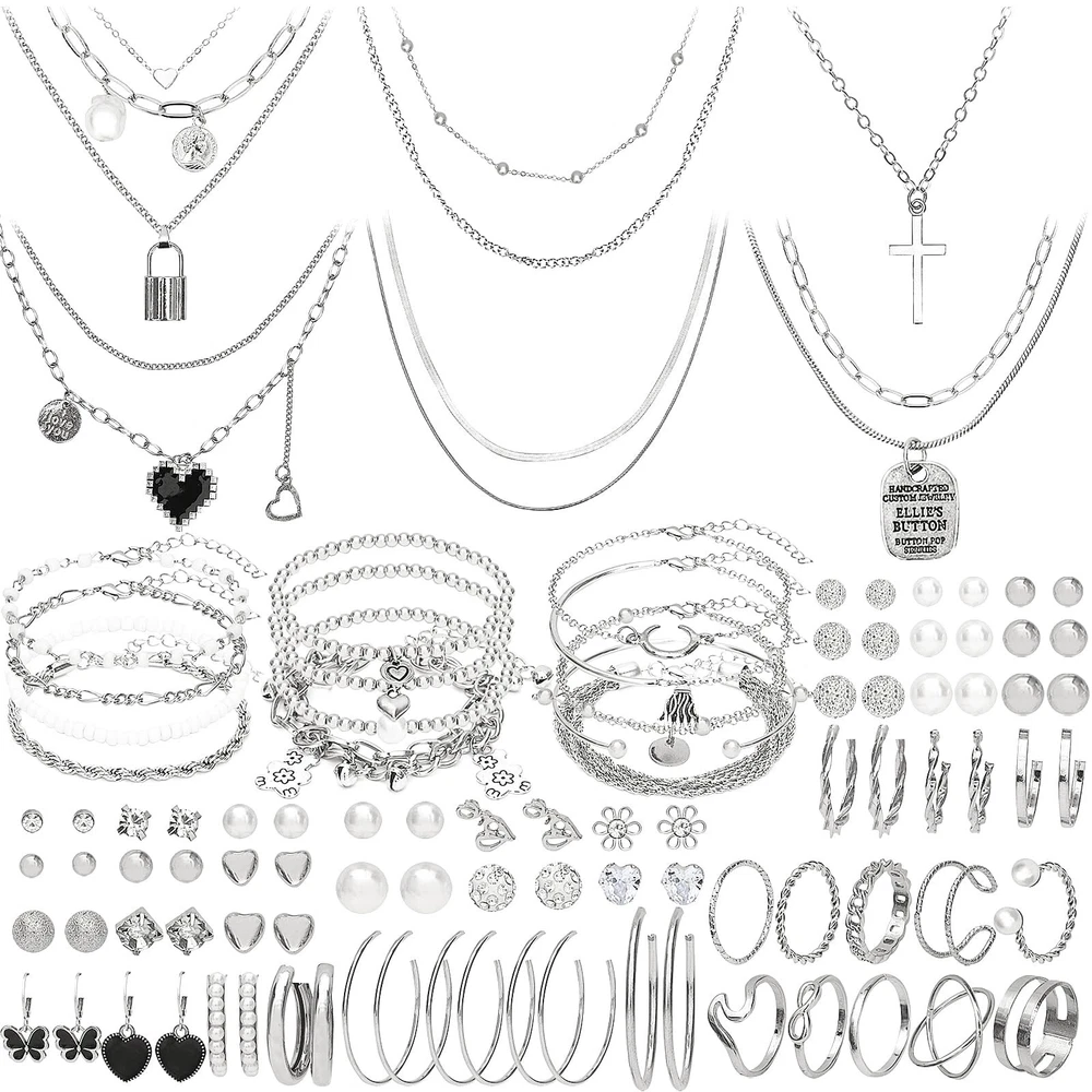 NEWITIN 100 Pieces Silver Jewelry Set for Women Fashion Costume Jewelry Silver Plated Necklace Bracelet Ring Silver Earrings Set for Women Product Details Color: Silver Jewelry Set Brand: NEWITIN MPN: NE3453 UPC: Does not apply EAN: Does not apply Date First Available : October 17, 2024 Brand, Seller, or Collection Name: NEWITIN Material: Metal Gem Type: No Gemstone Model number: NE3453 Metal: Alloy Metal stamp: No Metal Stamp Stone shape: variety Thinking about a special gift for Him/Her? Our women jewelry set would be a good choice. The jewelry set makes a perfect gift for any occasion, best fits for Birthday, Wedding Anniversary, Valentine's Day, Mother's Day, Christmas and any other Big day. In addition, your love can wear the jewelry with your blessing every day. The Bling Bling jewelry set keeps shining beautifully and magnificently. Good value for money and make a great gift too! About Our Store We focus on all kinds of fashion earrings, bracelets, necklaces, Piercing. Most of our products are with stainless steel material, we will test for some days before we release the new products, we care about the quality when you received it and the comfort when you are wearing, we want to do our best to bring you a nice buying experience in our store. Note: Don‘t touch water or sweat,use a soft cloth to gently scrub.If the gloss is dark,you can wipe it with toothpaste and it will be bright