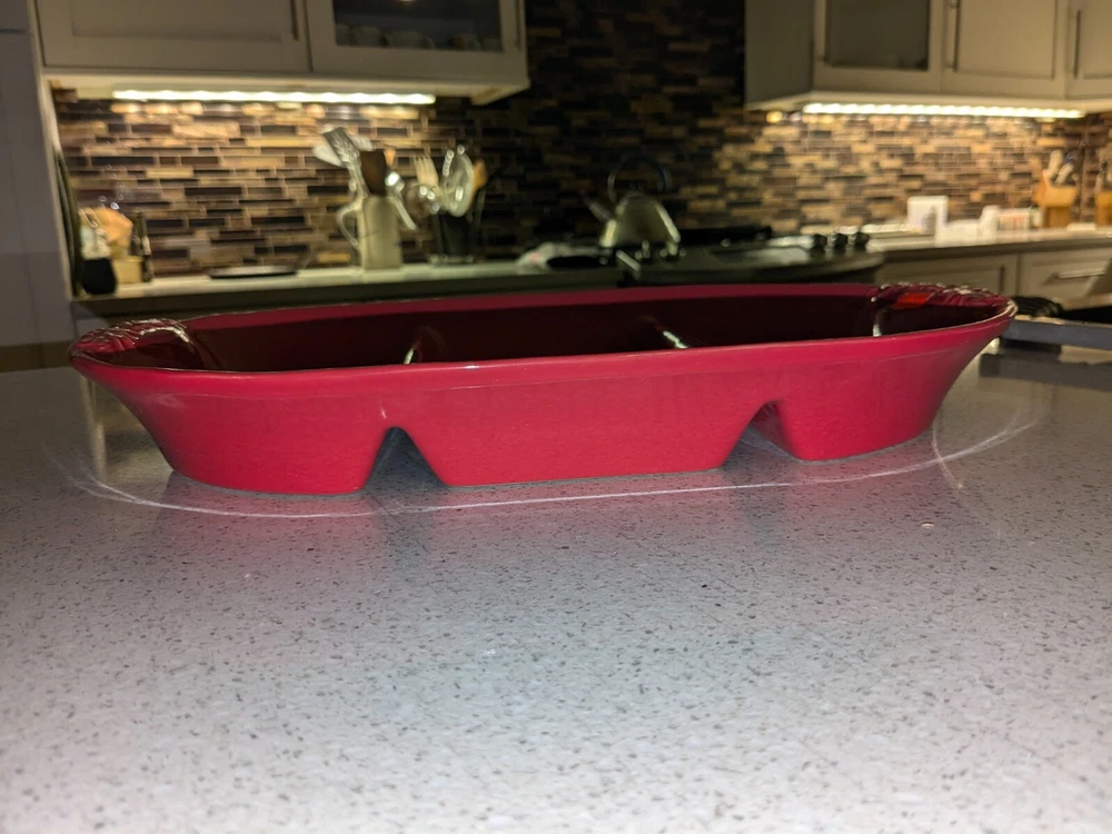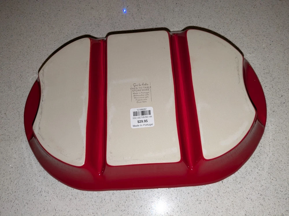 NEW-Sur La Table Stoneware 9 1/2" x 12 1/4" Rectangular 3-Section Dish w/ Grips. Oven, microwave, dishwasher and freezer safe. Originally purchased for $12, never used, and offered here for less. Ideal for heating a main dish and 2 sides. Shipment via USPS Ground Advantage. Local pickup is also available.