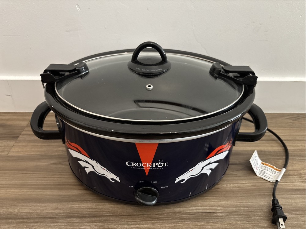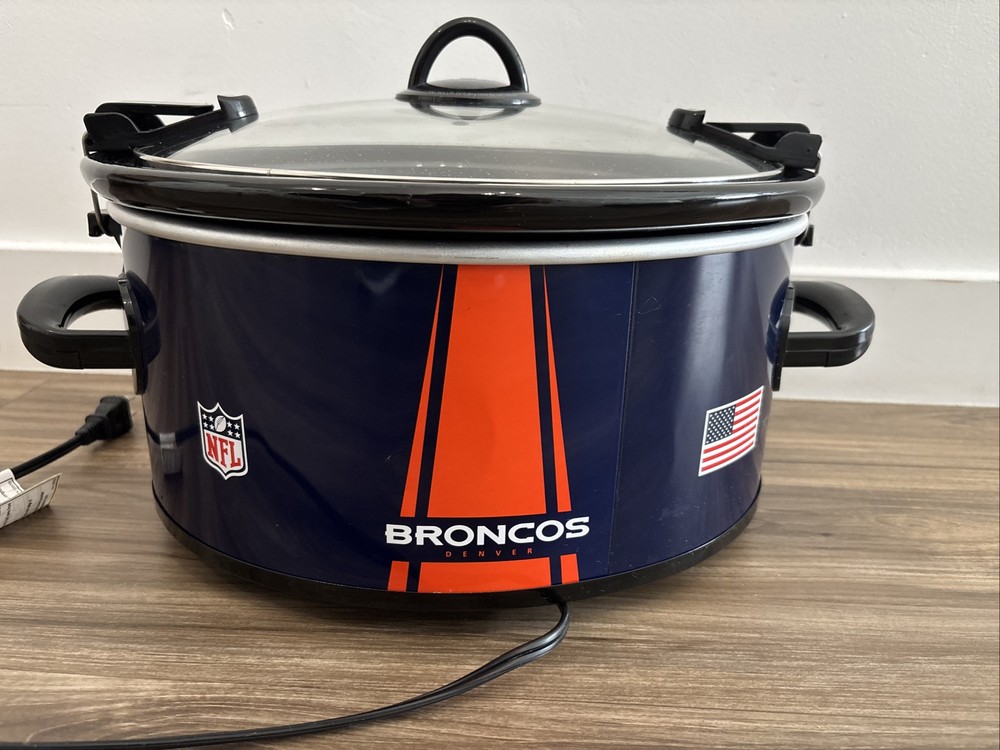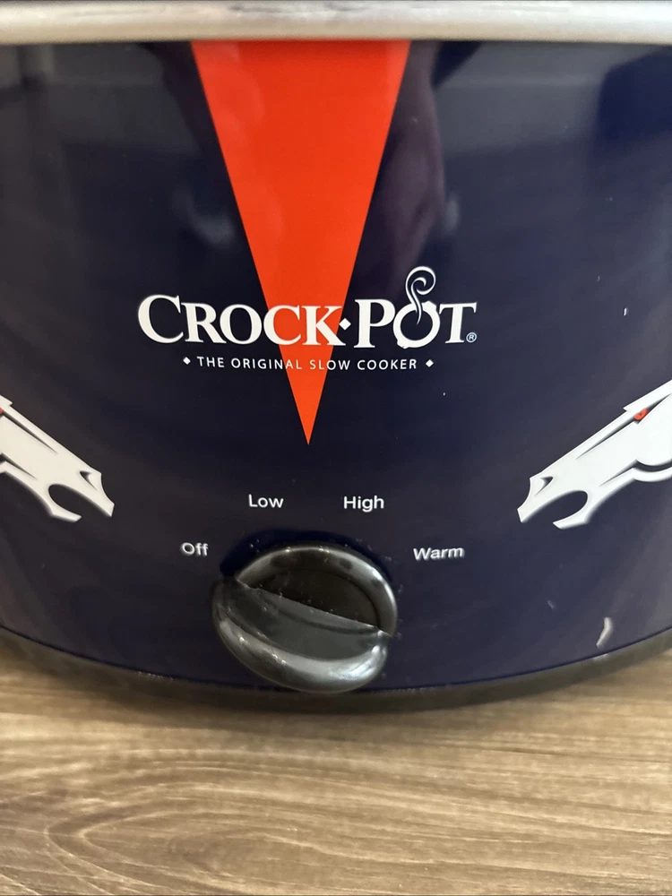 The NFL Crock-Pot Slow Cooker in a 6-quart size features a sleek blue design with a glossy finish, perfect for showcasing team pride for the Denver Broncos. This electric slow cooker operates at 120 volts and 240 watts, offering three settings/programs for versatile cooking options. It includes a locking lid for secure transportation to tailgates or Super Bowl parties, along with a 30-inch cable length for convenient use. The Crock-Pot also comes with a lid as the included component, making it a practical and stylish addition to any kitchen.