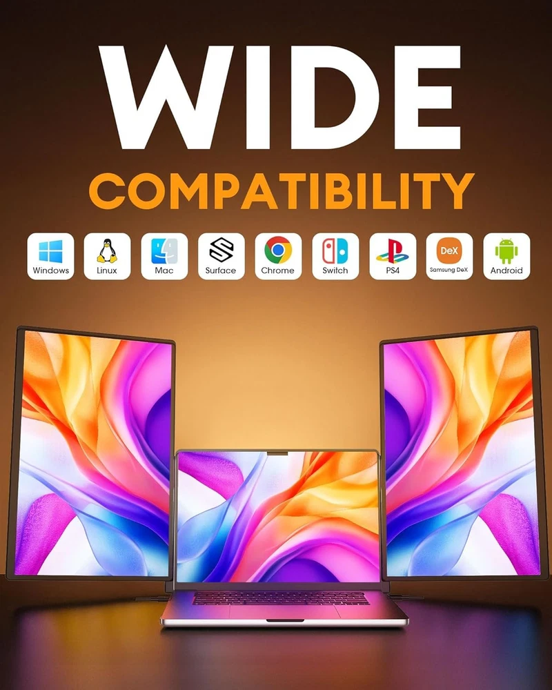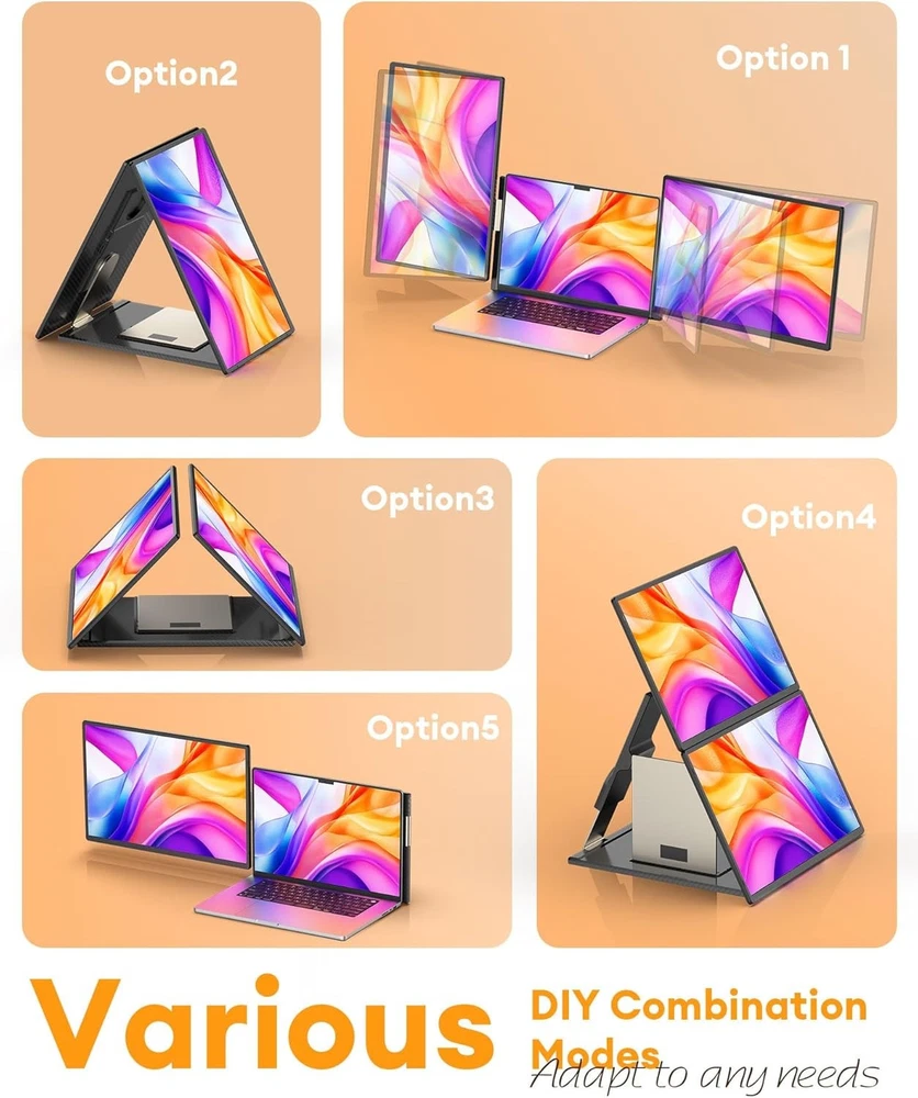 NGTeco Laptop Screen Extender, 16" FHD 1200P IPS Laptop Monitor Extender Triple Screen, Portable Monitor for Laptops 13-17" with Type-C/HDMI/USB-A Port Plug & Play for Wins/Mac/Chrome About this item [Expansive 16-Inch 1200P Display] Upgrade your workspace with a spacious 16-inch display in a 16:10 aspect ratio, offering 11% more vertical screen real estate than standard 15.6" monitors. With 1920×1200 (1200P) resolution and ultra-thin bezels, it delivers crisp visuals and an immersive edge-to-edge viewing experience—ideal for multitasking, content creation, and immersive media. [Dual Rotating Screens for Maximum Flexibility] Unlock over a dozen display configurations with dual screens that rotate 235° horizontally and 90° vertically. Whether you prefer a panoramic side-by-side setup, a stacked coding view, or a focused single-screen mode, the NGTeco S7 adapts to your workflow. Detachable screens provide added versatility when used independently. [Wide Laptop Compatibility, Secure Fit] Designed for laptops from 13" to 17.3", the extender fits any device with a screen width of up to 16.9 inches. The adjustable rear bracket ensures a secure and stable mount, making it compatible with a broad range of Windows and macOS devices for plug-and-play integration. [Smart Compatibility Notes] For MacBooks with M1/M2/M3 chips, dual-screen functionality may require an H5 hub (include) and driver installation. Common issues like “one screen working,” “no signal,” or “screen flickering” are usually compatibility-related and easily resolved. Reach out via NGTeco Support for prompt assistance—we’re here to ensure smooth setup and use. [Magnetic, Foldable & Home Office Ready] Built for convenience, the magnetic folding design allows quick setup and storage in the included carrying case. While the full system weighs 9.94 lbs, making it less travel-friendly, it's a solid choice for home offices or semi-permanent setups.