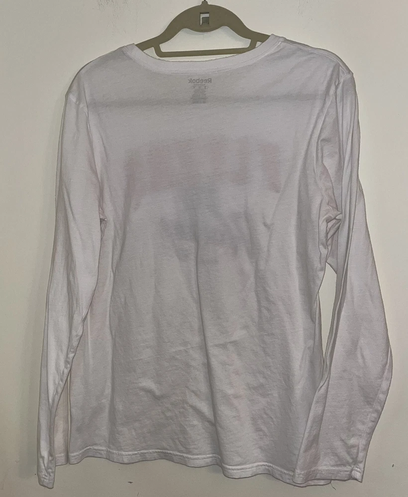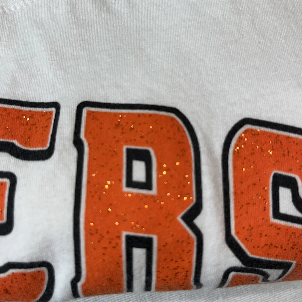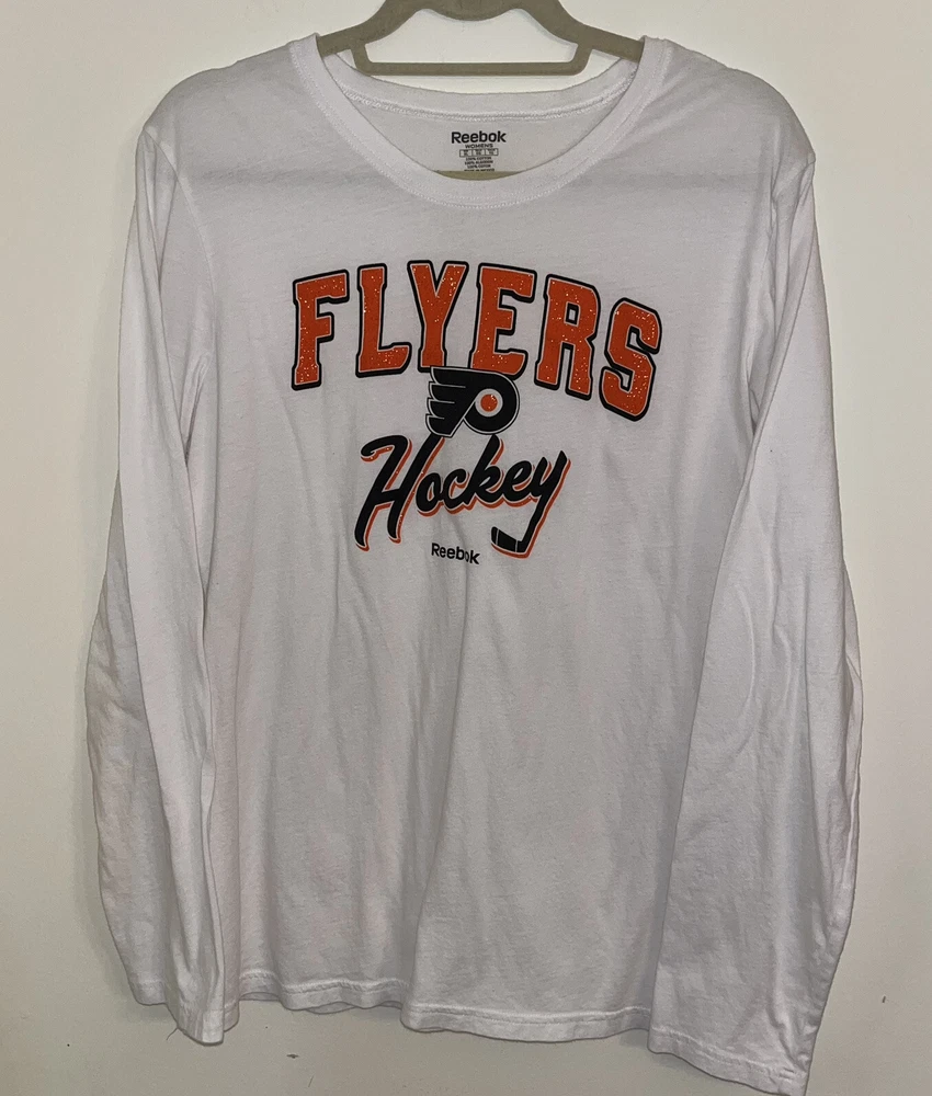 NHL Flyers Hockey Womens Long Sleeve White Tshirt Orange Black Logo Size Large Crew Neck Glitter letters. Look at photos for measurements as this is 100% and has likely shrunk.