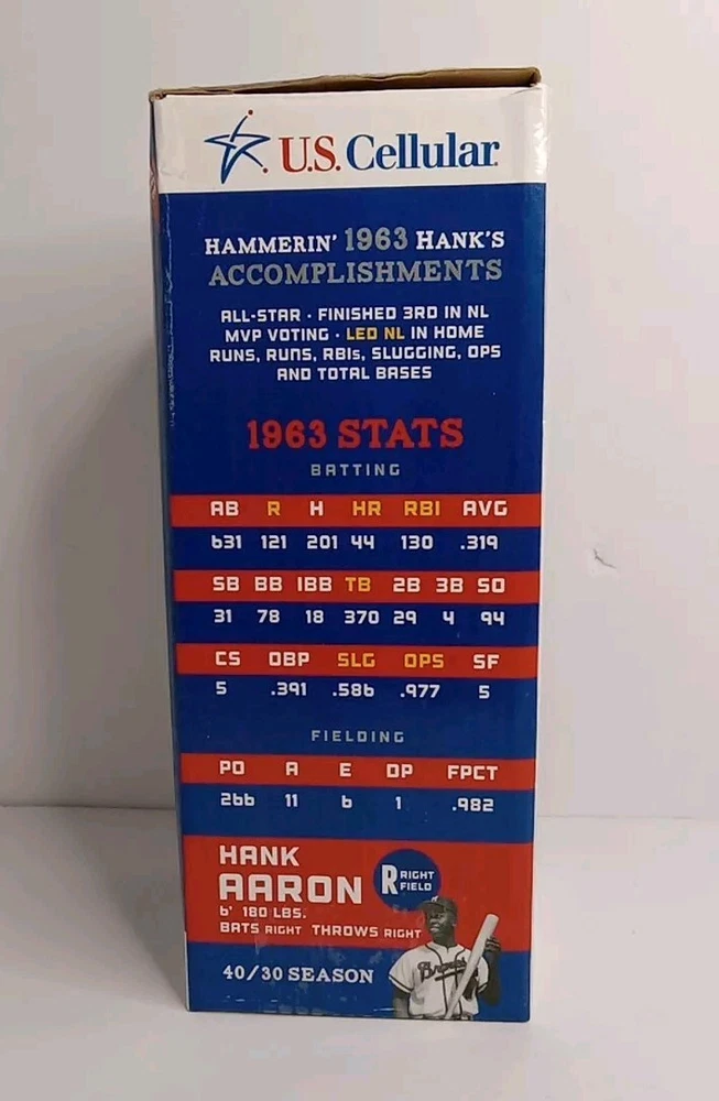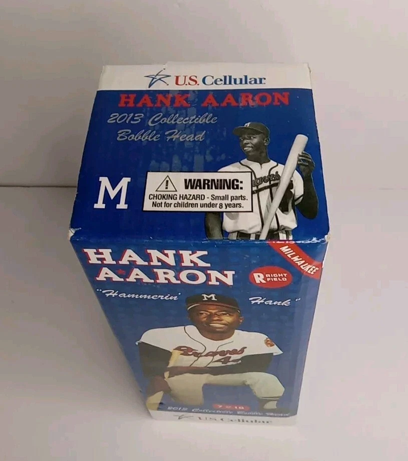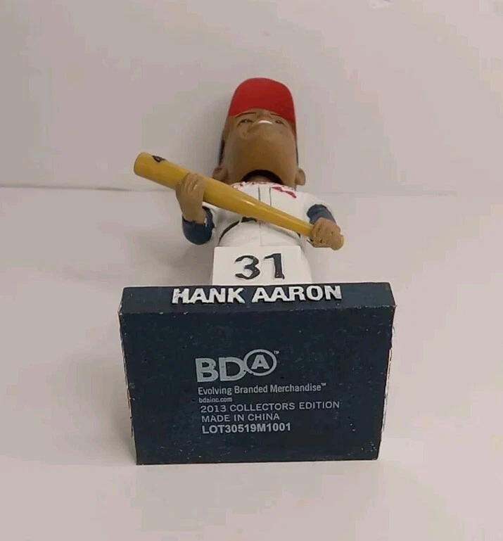 New in box. Some tape on box. As is. This officially licensed, major league baseball bobblehead features the legendary Hank Aaron of the Atlanta Braves. The multi-color design and unisex adult gender make it a perfect addition to any baseball fan's collection. This product is a must-have for any fan of the sport and is perfect for displaying during regular season games. The Bobblehead is in its original packaging (NIB) and is ready to be displayed in your home or office.