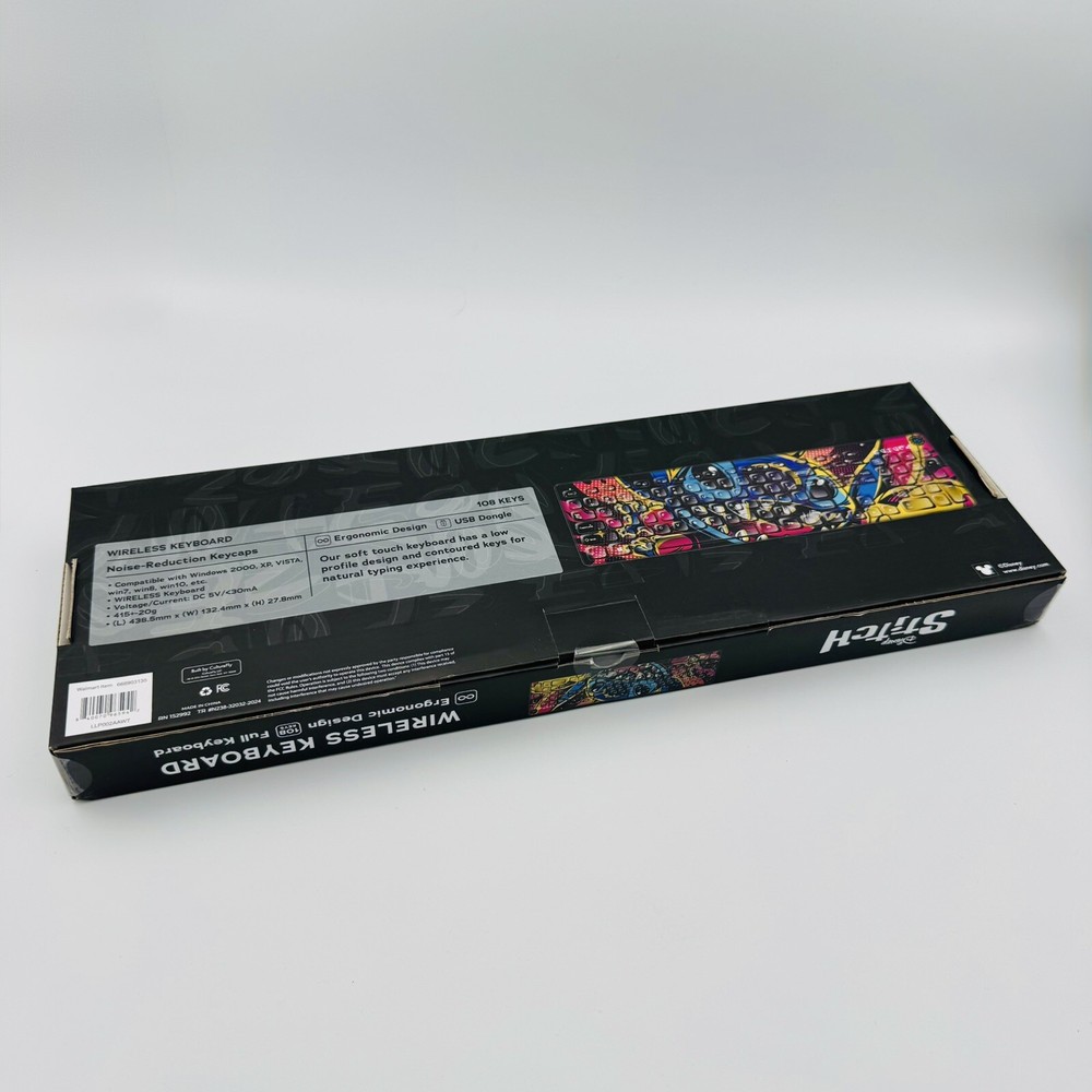 The product is a Disney Stitch-themed wireless keyboard with an ergonomic design, featuring noise reduction keycaps for quiet typing. It has a multicolor design and standard keyboard layout, with a USB connection for easy plug-and-play use. The keyboard is in new condition and is suitable for English language typing. It offers a fun and functional option for fans of Disney's Stitch character who are looking for a comfortable and quiet typing experience. Please check pictures carefully for details