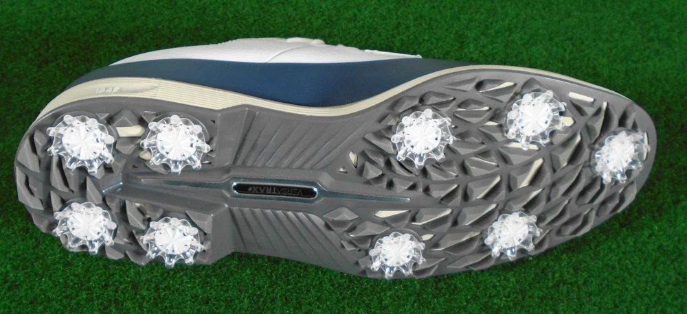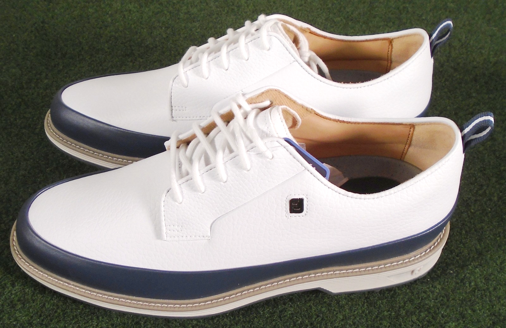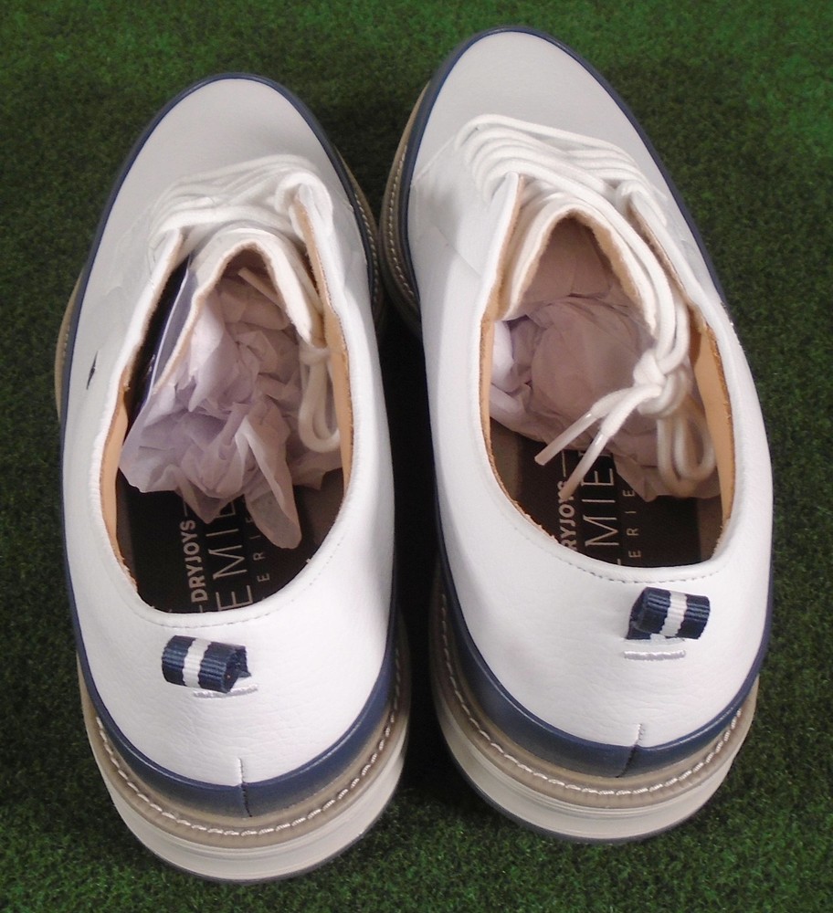 New in box Footjoy Premiere Field LX men's golf shoes, white / navy, item #54395. Premium Waterproof Leather Full Leather Linings Pulsar Low Profile Cleats by Softspikes FastTwist 3.0