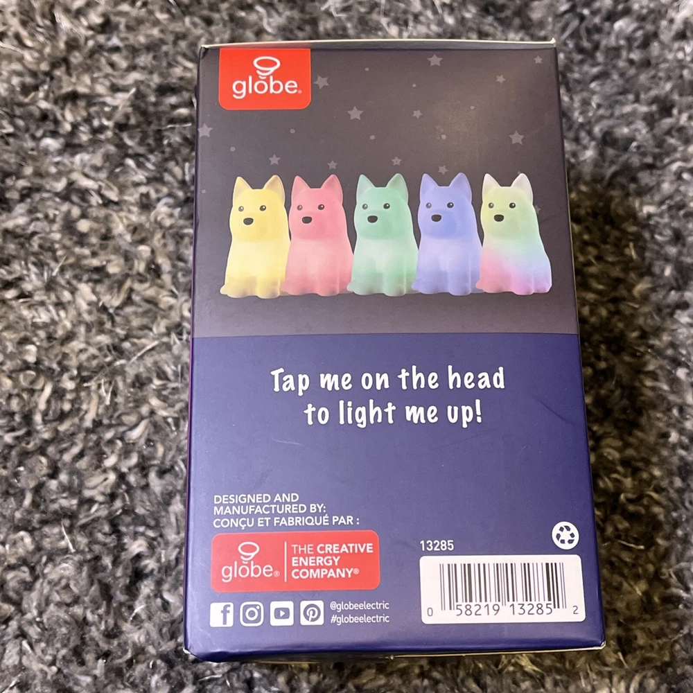 The NIB Globe Tucker The Dog LED Color Changing Rechargeable Lamp is a whimsical and functional bedside lamp for kids. Made of BPA free silicone, this free-standing lamp features a touch sensor for easy on/off functionality. It emits a multicolor light through LED technology and is powered by USB for convenience. With a cute dog design and color-changing feature, this lamp is perfect for creating a cozy and playful atmosphere in a child's bedroom or any indoor space.
