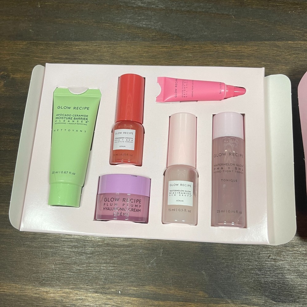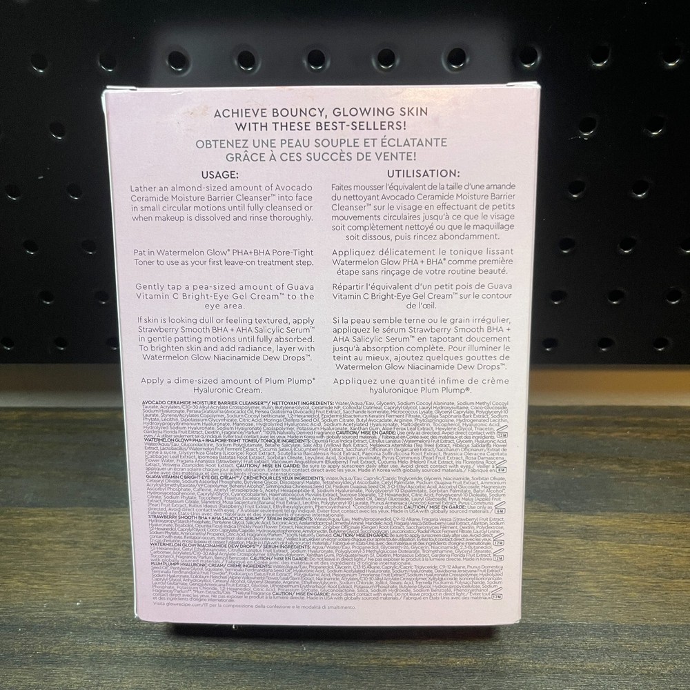 0.1 oz/ 3 mL Guava Vitamin C Bright-Eye Gel Cream, 0.3 oz/ 10 mL Strawberry Smooth BHA+AHA Salicylic Serum, 0.5 oz/ 15 mL Plum Plump Hyaluronic Cream, 0.5 oz/ 15 mL Watermelon Glow Niacinamide Dew Drops, 0.6 oz/ 20 mL Avocado Ceramide Moisture Barrier Cleanser, 0.8 oz/ 25 mL Watermelon Glow PHA+BHA Pore-Tight Toner