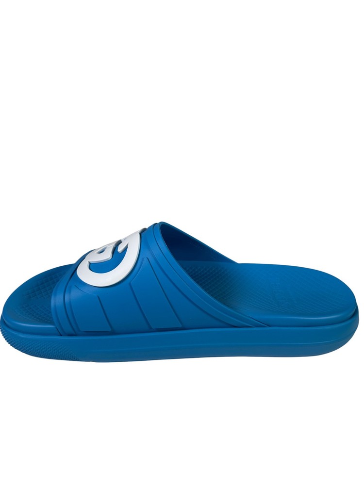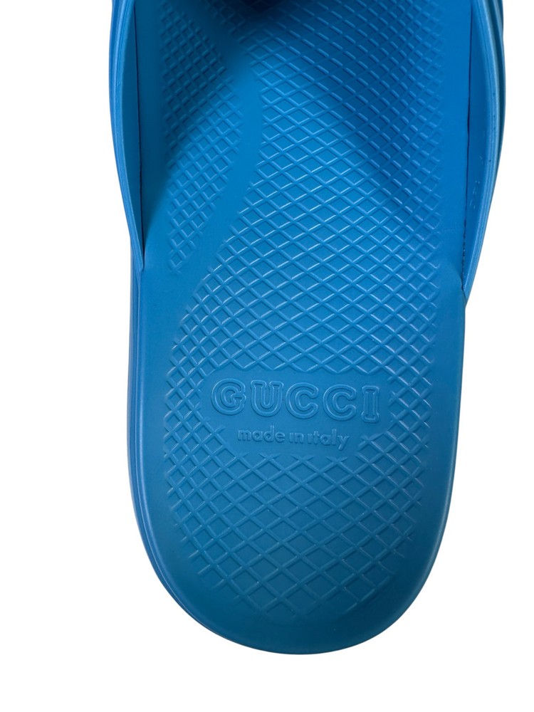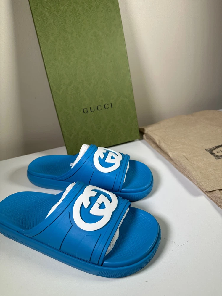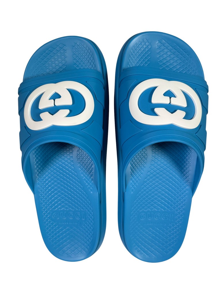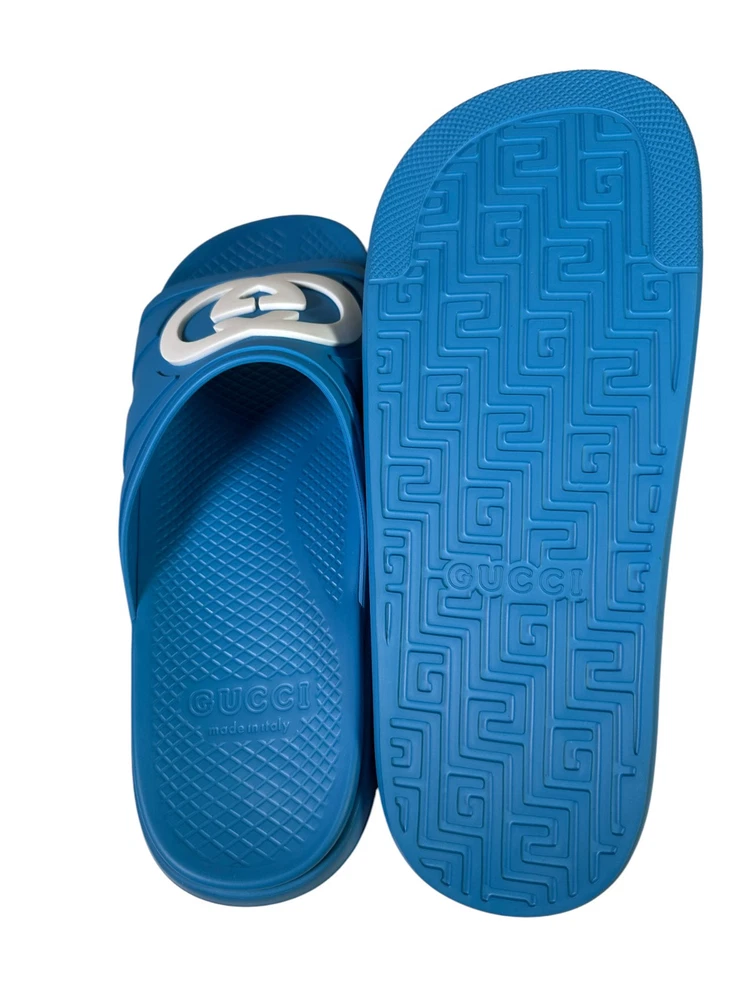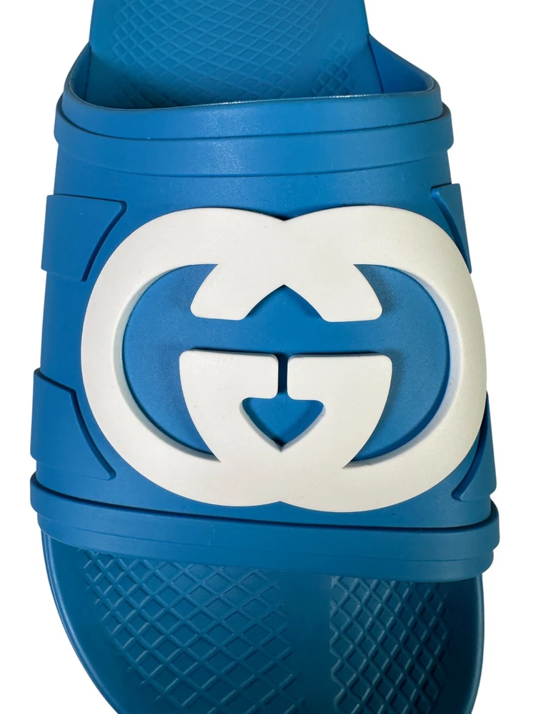 100% Authentic new in box Gucci rubber slide sandals in bright blue with oversized interlocking GG logo in white across the strap. Made in Italy. Includes original Gucci box and dust bag as shown in photos. Details: Brand: Gucci Style: Rubber Slide Sandals Color: Blue with white GG logo Material: 100% rubber Size: UK9 US9.5 Condition: New in box Includes: Gucci box and dust bag Made in Italy