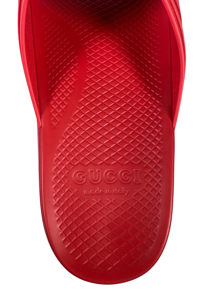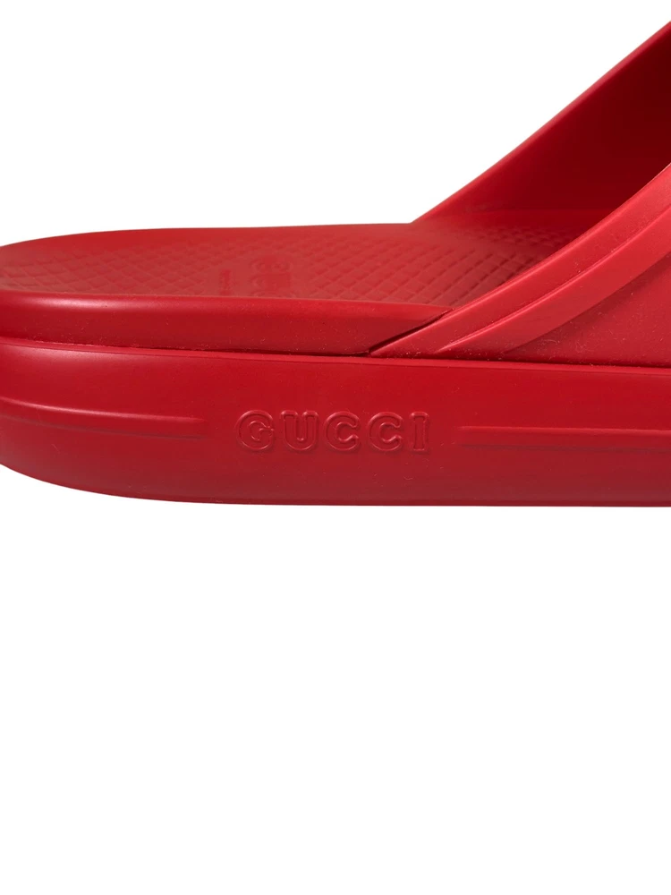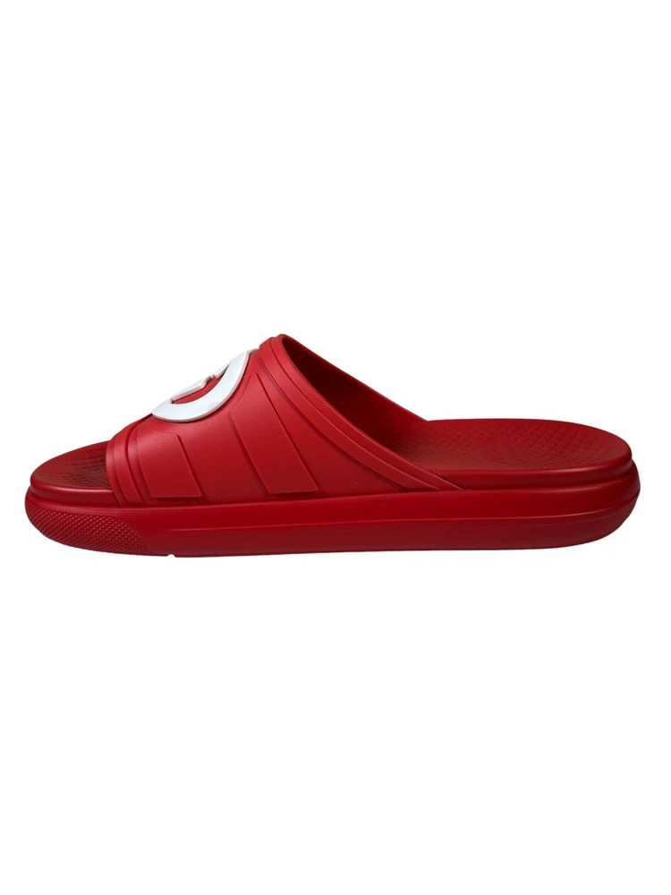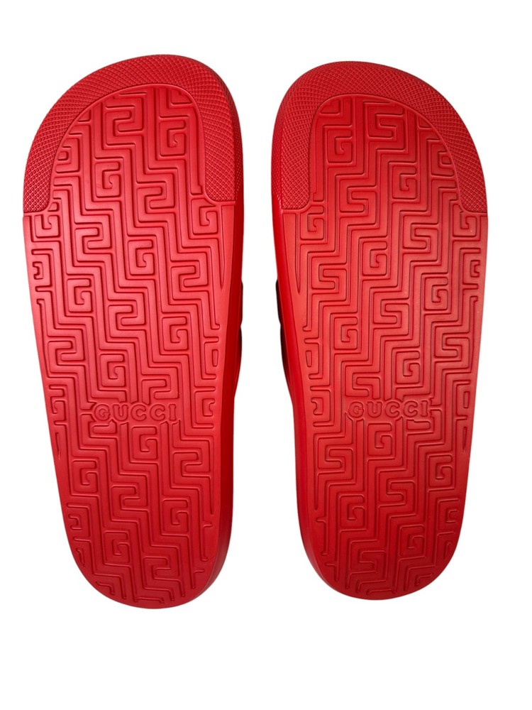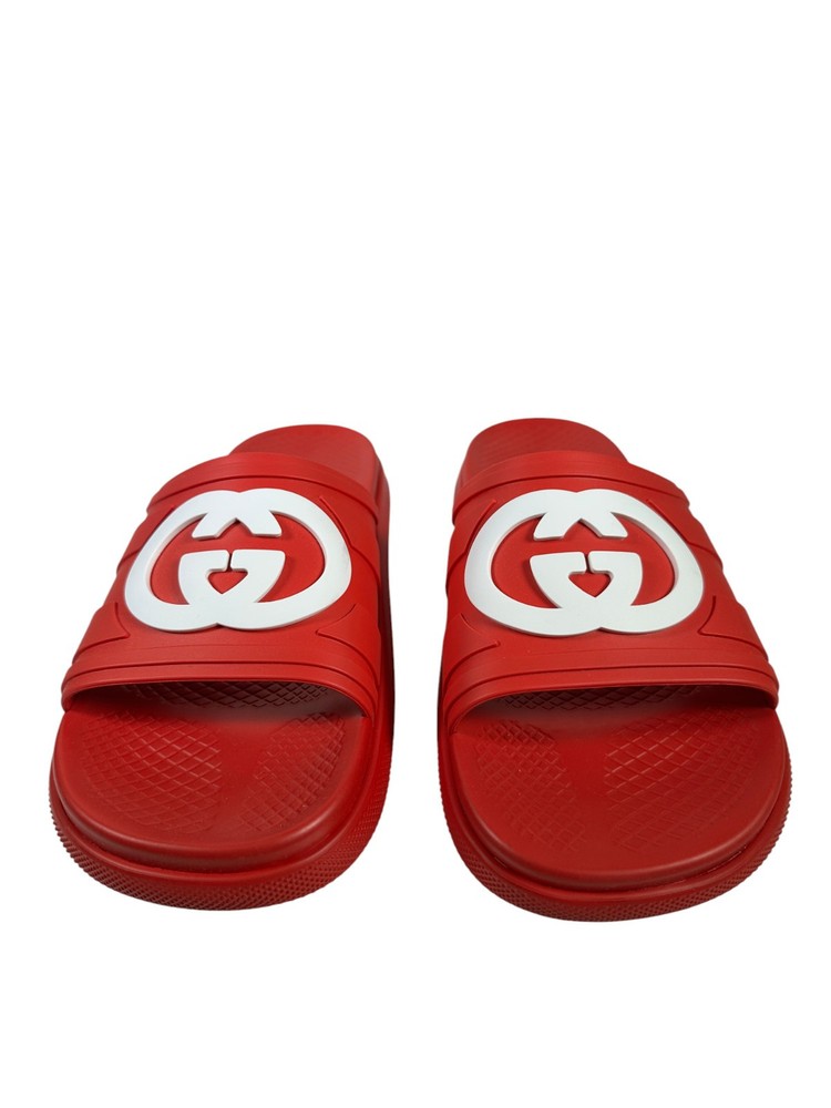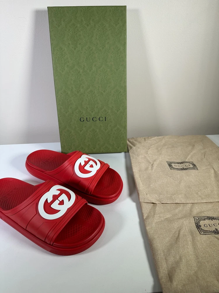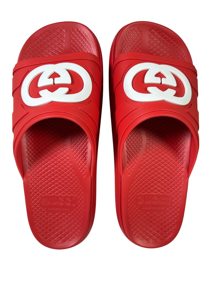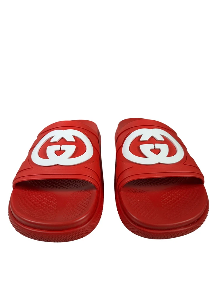 100% Authentic new in box Gucci rubber slide sandals in red with oversized interlocking GG logo in white across the strap. Made in Italy. Includes original Gucci box and dust bag as shown in photos. Details: Brand: Gucci Style: Rubber Slide Sandals Color: Red with white GG logo Material: 100% rubber Size: UK10 US10.5 Condition: New in box Includes: Gucci box and dust bag Made in Italy