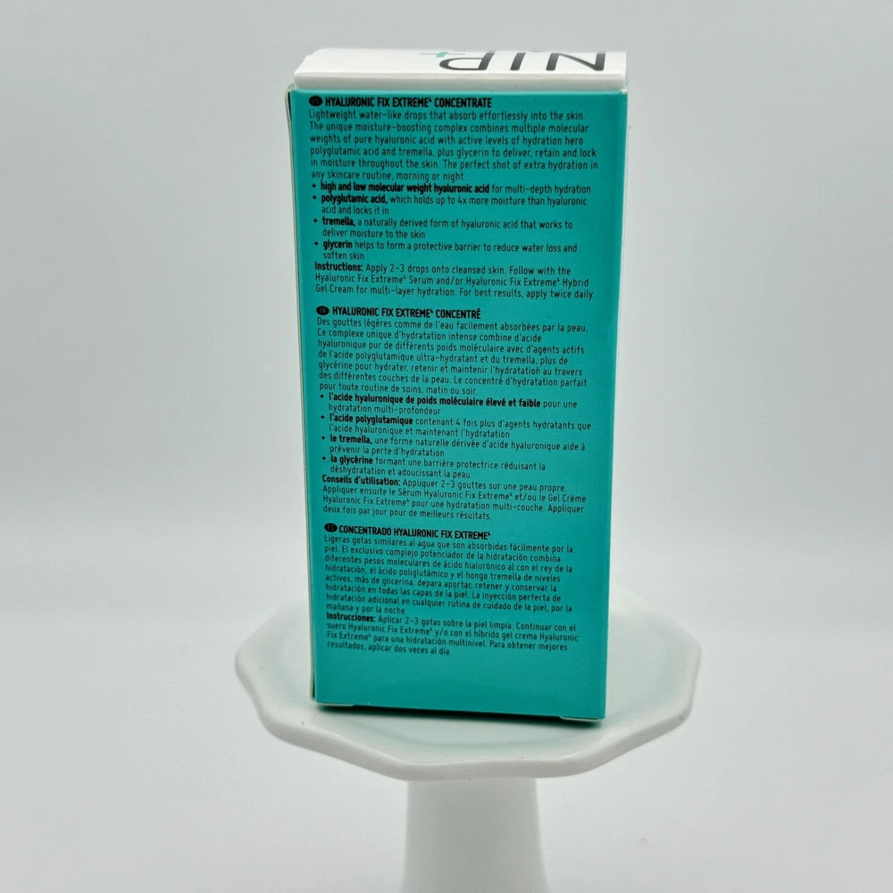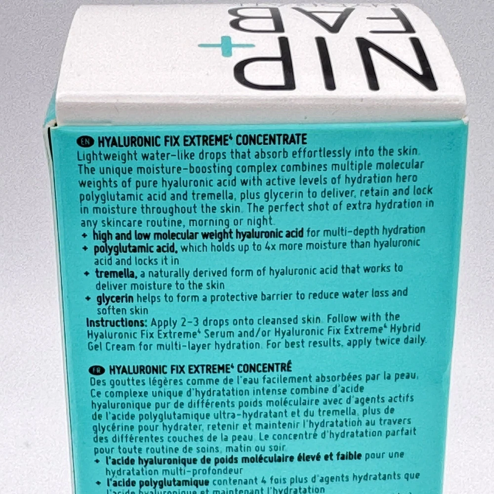 NIB Nip + Fab Hydrate Hyaluronic Fix Extreme Concentrate 1.01 oz Full Size. New in Box NIB HYALURONIC FIX EXTREME' CONCENTRATE Lightweight water-like drops that absorb effortlessly into the skin. The unique moisture-boosting complex combines multiple molecular weights of pure hyaluronic acid with active levels of hydration hero polyglutamic acid and tremella, plus glycerin to deliver, retain and lock in moisture throughout the skin. The perfect shot af extra hydration in any skincare routine, morning or night. * high and low molecular weight hyaluronic acid for multi-depth hydration + polyglutamic acid, which holds up ta 4x more moisture than hyaluronic acid and locks it in + tremella, a naturally derived form of hyaluronic acid that works to deliver moisture to the skin * glycerin helps to form a protective barrier to reduce water lass and soften skin Instructions: Apply 2-3 drops onto cleansed skin Follow with the Hyaluronic Fix Extreme* Serum and/or Hyaluronic Fix Extreme* Hybrid Gel Cream for multi-layer hydration. For best results, apply twice daily. ---------------- Smoke-free home. Items stored in cool, dry space. Shipping We will ship your item within two business days of purchase. Combined Shipping is available and partial shipping amounts paid will be refunded when ordering more than one item within the same hour. Photos Please see photos for best description of the item’s condition. All photos are of the actual item listed for sale, unless otherwise noted. We do our best to provide proper photos and descriptions of the items to insure there are no surprises once received. Clothing and Fabric Items All clothing and fabric items have been steam cleaned and/or washed per eBay standards. Thank you for shopping Declutteringo!