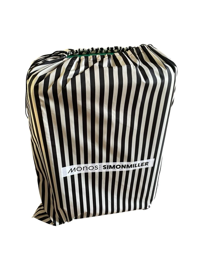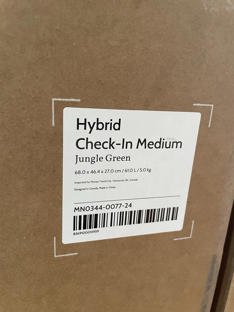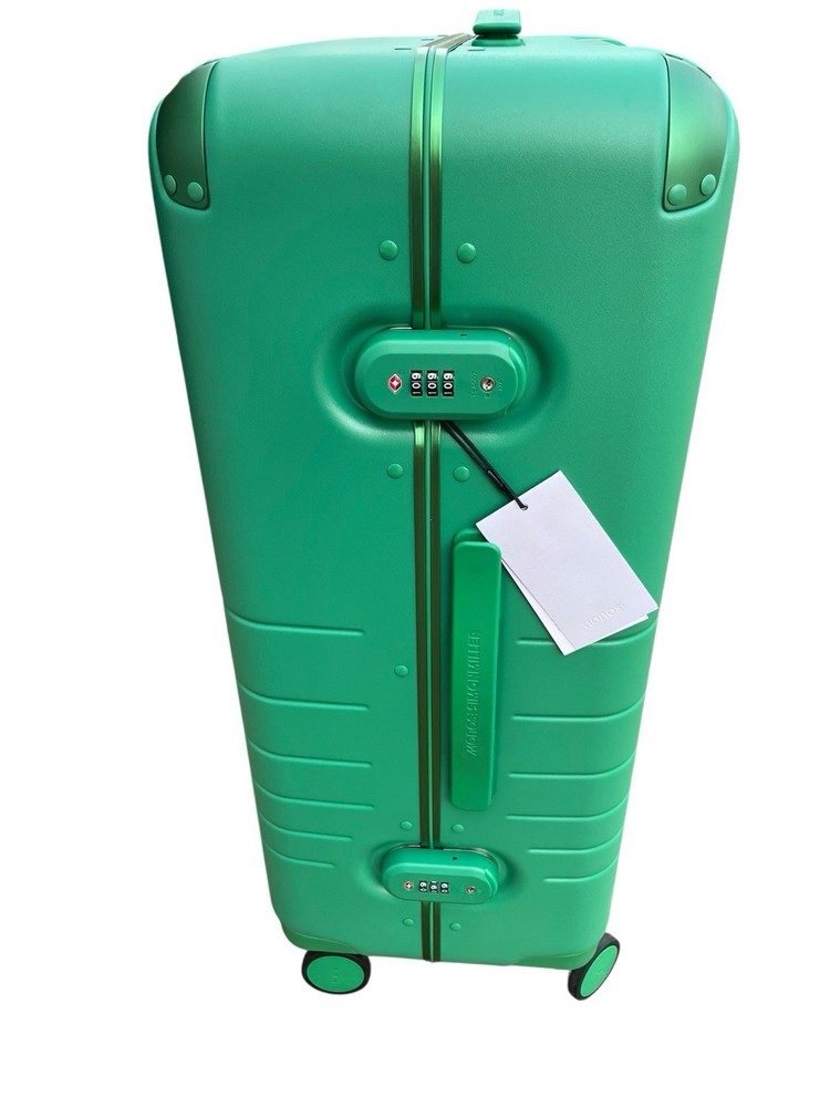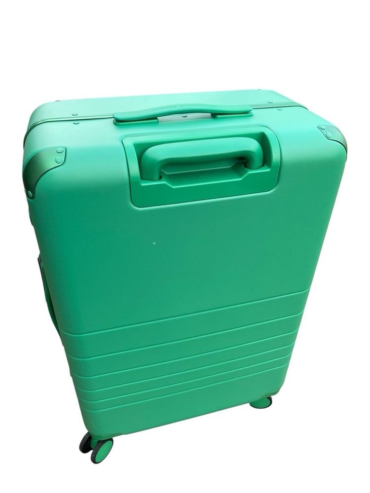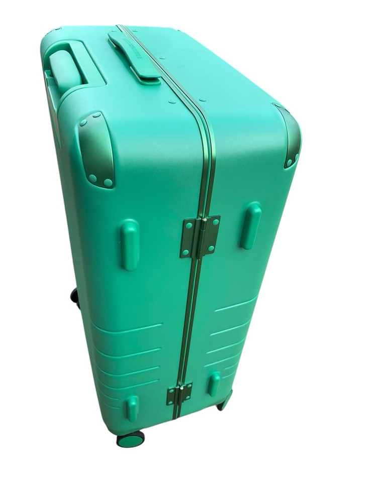 New in box Dimensions on box Water-resistant polycarbonate hard shell with recycled materials - 360 spinner wheels - Zipperless aluminum frame with corner guards - Adjustable telescopic handle - Color-matched components - Soft anti-microbial lining made from recycled polyester - Vegan leather trim - Two TSA-approved combination locks