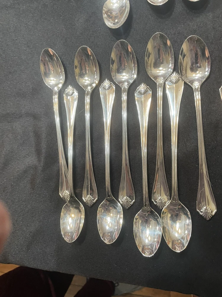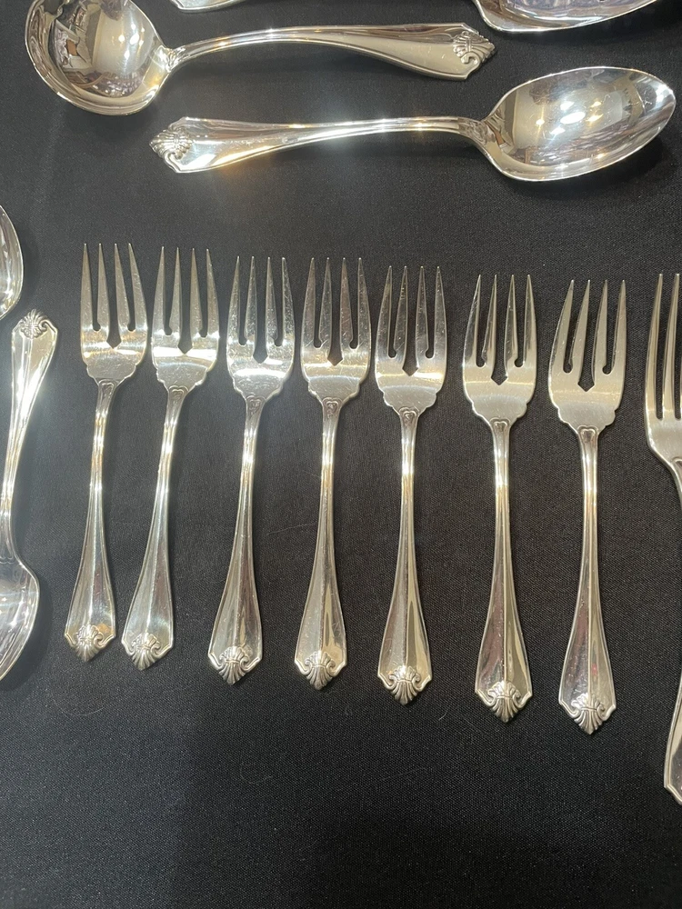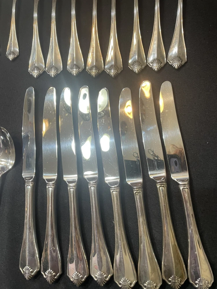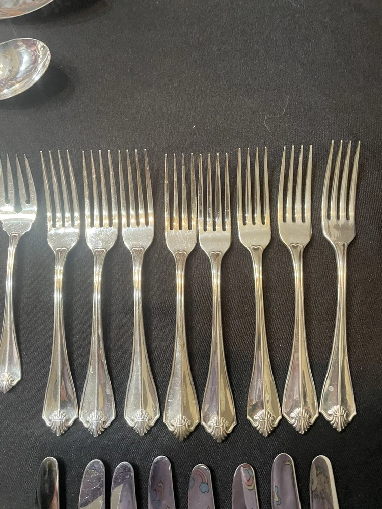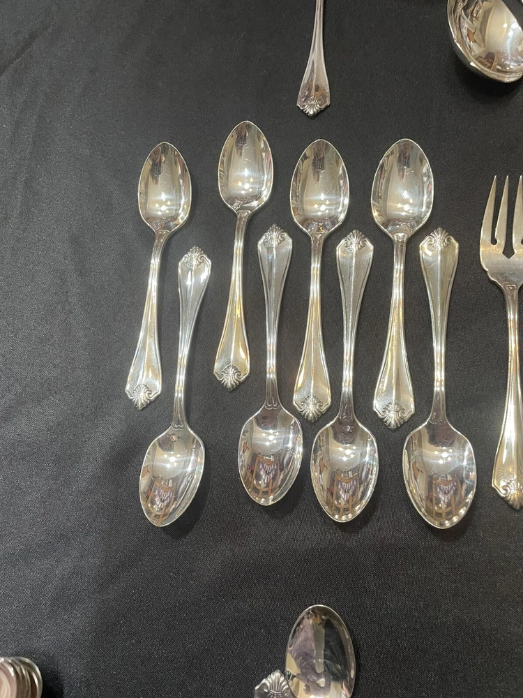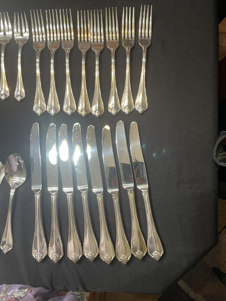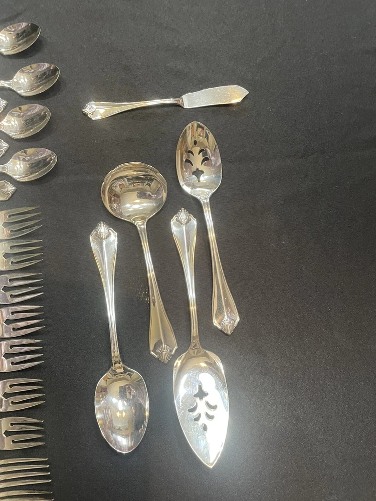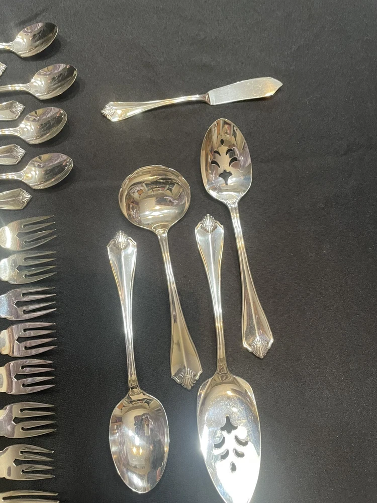 Type: Set Color: Silver Handle Pattern: King James Material: Silver Plated Brand: 1881 Rogers Handle Material: Silver Plated Set Includes: Serving Set, Serving Spoon, Slotted Spoon, Knife, Dinner Fork, Salad Fork, Iced Teaspoons, Teaspoons, Soup Spoons