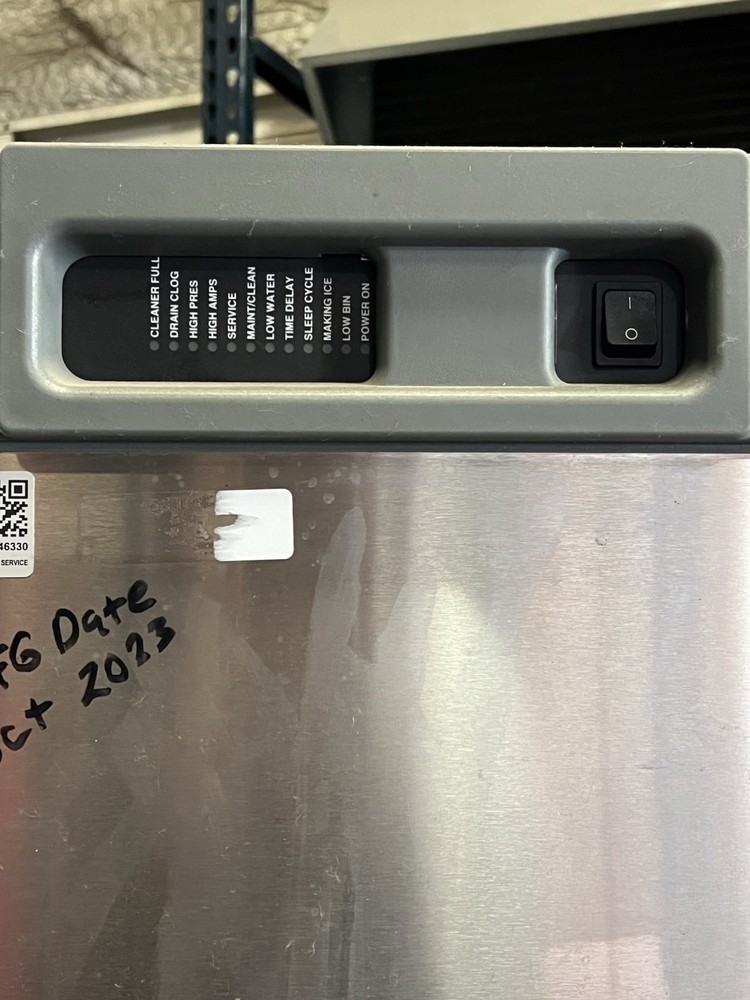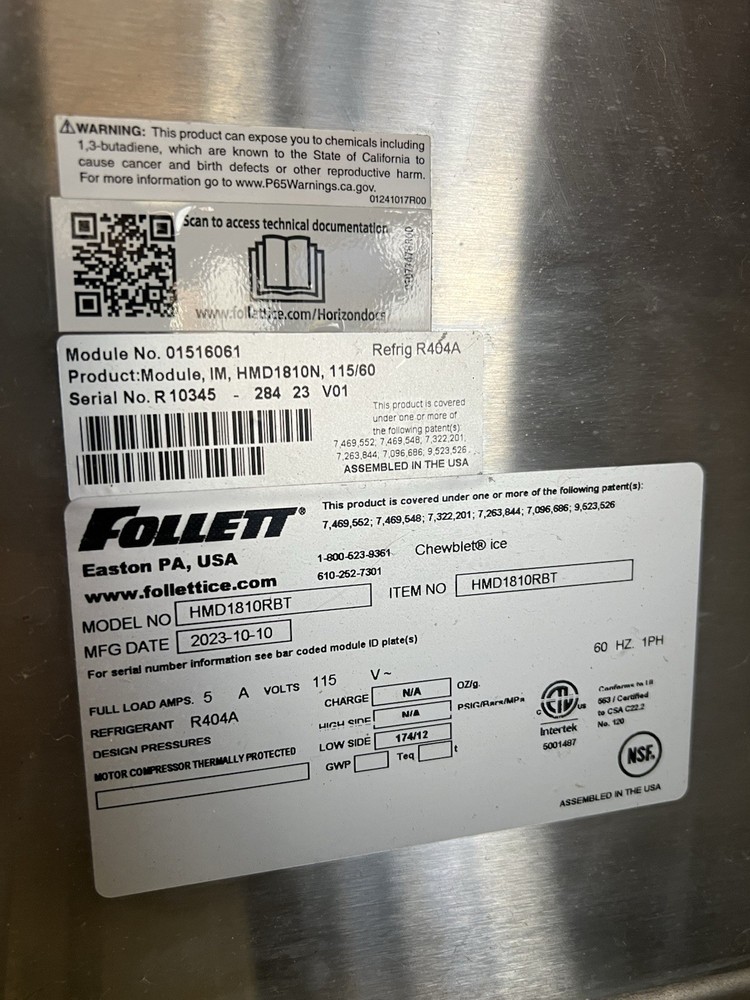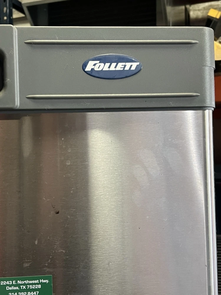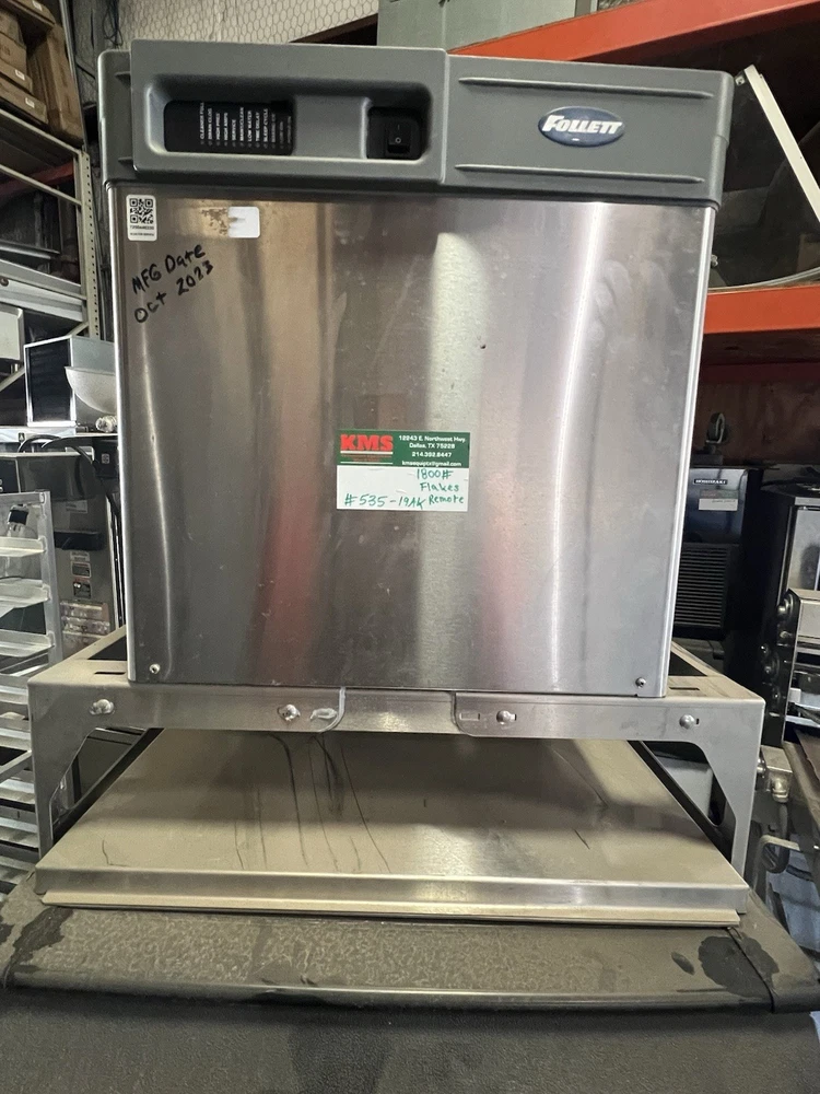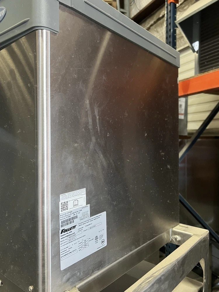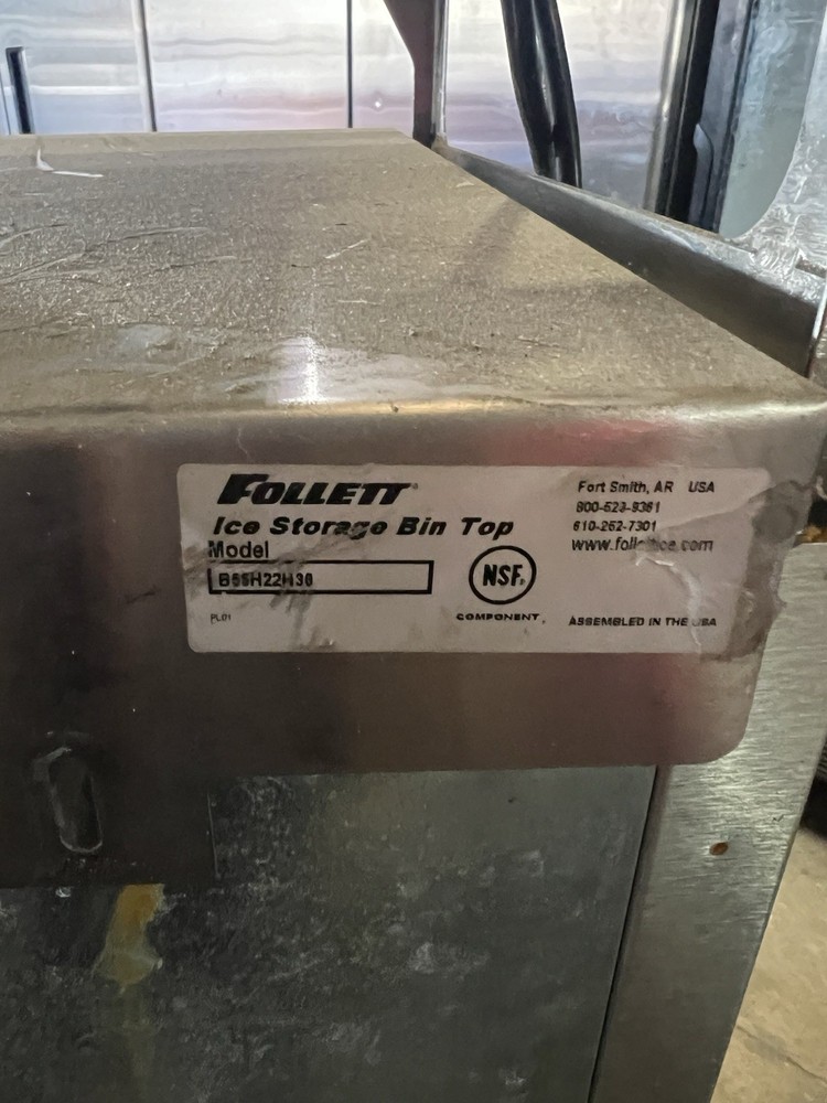 Nice used FOLLET Ice machine remote condenser 1800 pounds of chewable nugget ice per 24hrs, has few scratches on side but not very noticeable, has 6” of clearance so it sits little higher up on top of any ice bin, comes with movable ice bin carriage on wheels and handle model: B5SH22H30…… MADE IN USA