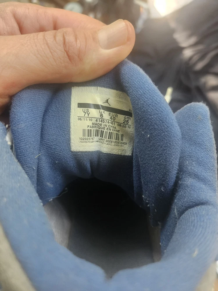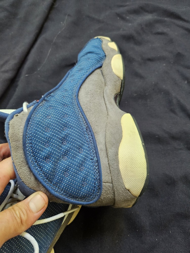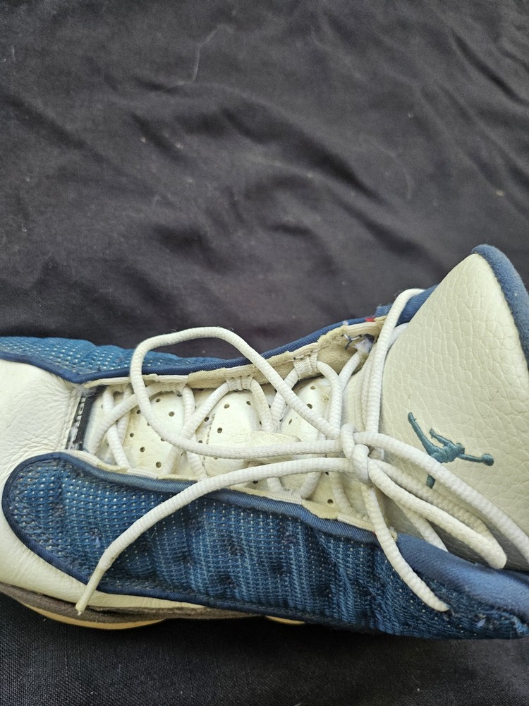 Blemishes pictured The NIKE AIR JORDAN XIII 13 RETRO GS FLINT GREY 414574 401 in size 7Y is a stylish and comfortable sneaker designed for boys. This athletic shoe features a closed toe, lace-up closure, and a high-top shoe shaft style. Made with a blended fabric upper and a rubber outsole, it offers moderate cushioning and adjustable fit, perfect for activewear and casual occasions during the summer, fall, and spring seasons. The gray color and Jordan logo accents add a touch of retro style to this Jordan 13 model, making it a must-have for young sneaker enthusiasts.