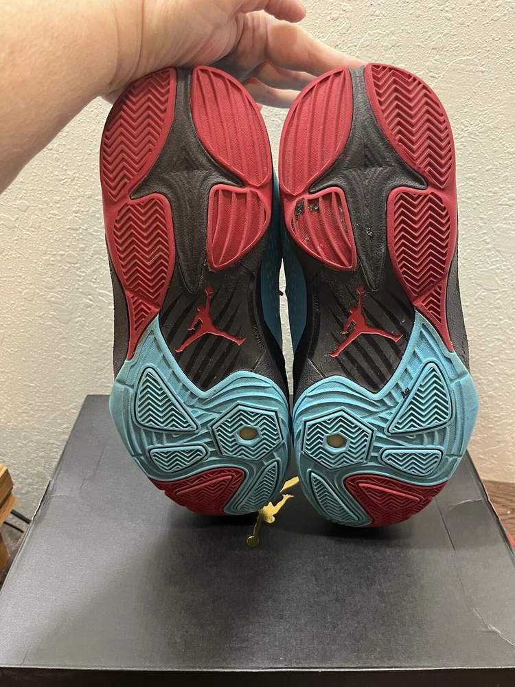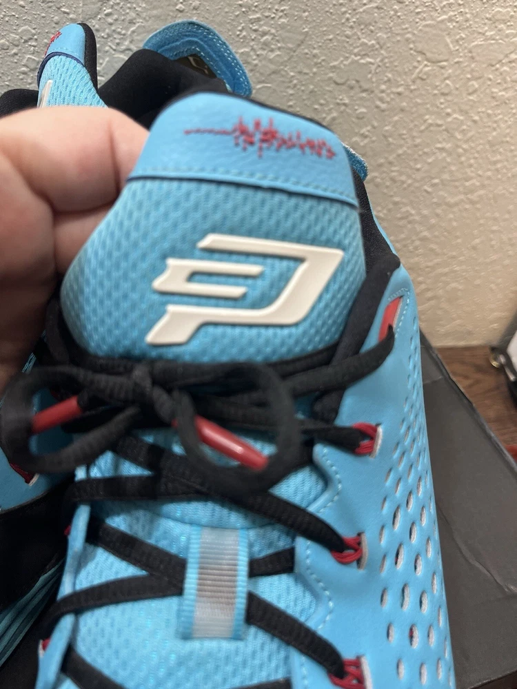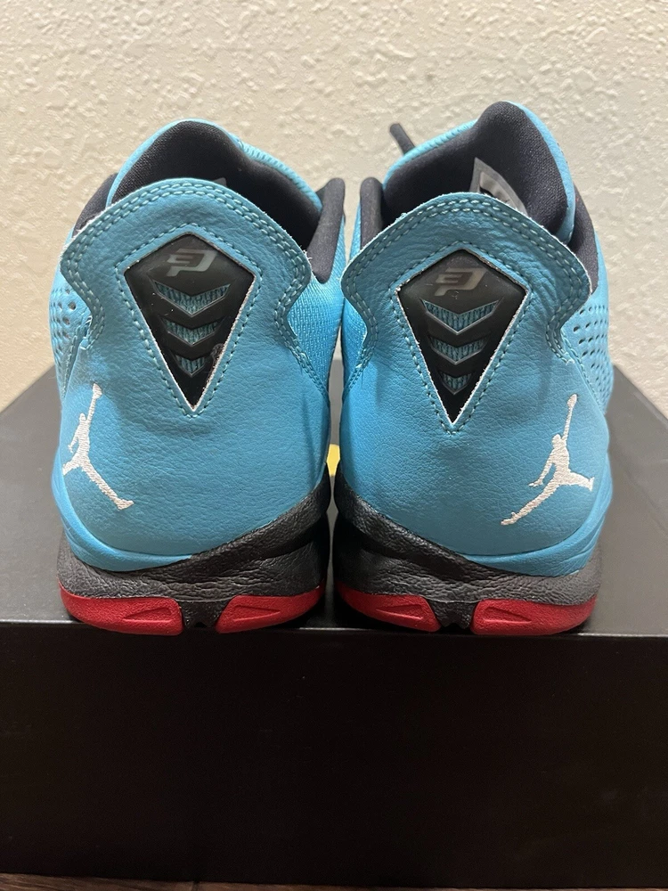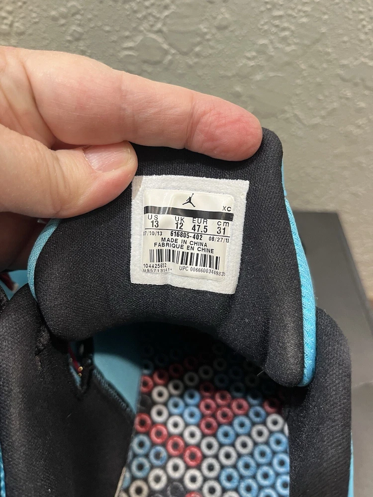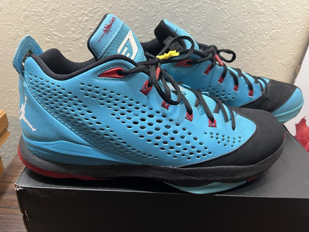Step up your sneaker game with these Nike Air Jordan CP3 VII Chris Paul 616805-402 Gamma Blue Phoenix Suns shoes. Designed with a low top shoe shaft style, these basketball shoes are perfect for cross training, CrossFit, casual wear, and basketball activities. Made with a nylon upper material, these shoes are durable and comfortable to wear. The shoes come in a stylish Gamma Blue color with a geometric pattern and a character of Teal Blue. They have a standard shoe width and are available in US Shoe Size 13, UK Shoe Size 12, and EU Shoe Size 47.5. The shoes were manufactured in China in 2013 and have a style code of 616805-402. These athletic shoes are a perfect addition to any sneaker collection and are sure to make a statement. Preowned shoes in good solid bright condition. The tread is really good as well. The shoes on the left hand toe have a light 1 inch scuff right below the shoelaces. There is some light discoloration from wire around the front right toe on the inside and of course there is light discoloration around the rings and soles of the shoes from light use.these shoes were produced in 2013 and are an overall really good shape. Price below market to adjust for minor flaws. Does not come with original box.
