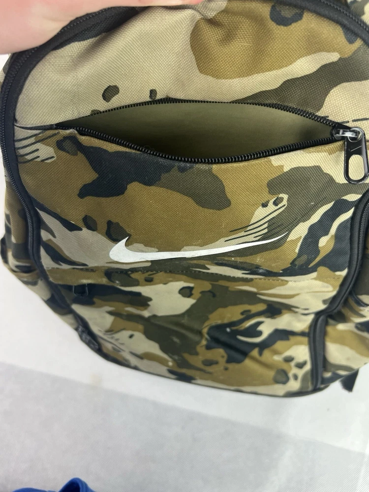 The product is a Nike Brasilia XL Camo Laptop Backpack in a khaki camouflage pattern. Designed for men, this colorful backpack is made of polyester material and features inner and outer pockets, inner dividers, a laptop sleeve for protection, adjustable straps, and a lightweight design. With a spacious interior and plenty of pockets, this backpack is ideal for carrying a laptop and other essentials while on the go.