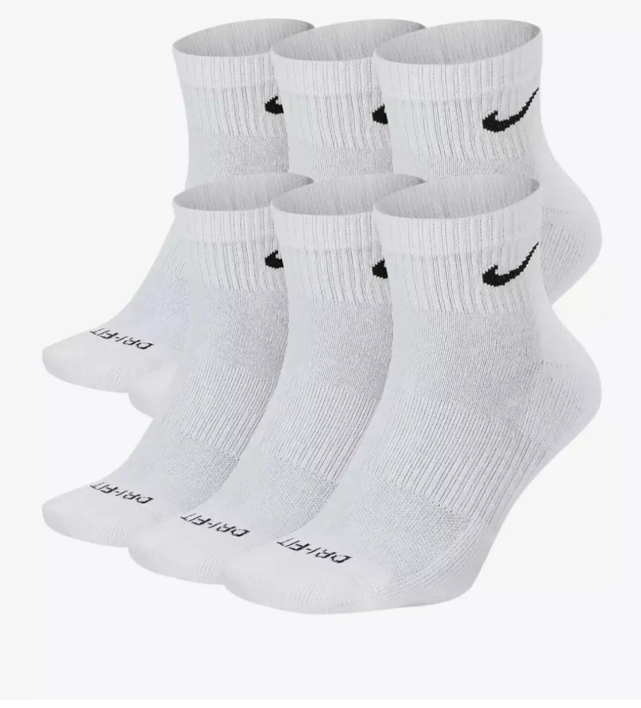 Handmade: No Features: Cushioned Brand: Nike Toe Style: Full Toe Performance/Activity: Baseball, Basketball, Bodybuilding, CrossFit, Cross Training, Cycling, Dance, Football, Golf, Gym & Training, Hiking, Hockey, Hunting, Lacrosse, Pilates, Racing, Riding, Rugby, Running & Jogging, Skateboarding, Skiing, Soccer, Squash, Tennis, Track & Field, Volleyball, Walking, Weightlifting, Wrestling, Yoga Style: Ankle Socks Opacity: Opaque Theme: Sports Material: Cotton UPC: 888407233876 Pattern: Solid Department: Women Size: L Sock Length: Mid Calf Number in Pack: 6 Pairs Country/Region of Manufacture: Honduras Season: All Seasons, Fall, Spring, Summer, Winter Personalize: No Color: White Garment Care: Machine Washable Occasion: Everyday gtin13: 888407233876 Type: Socks