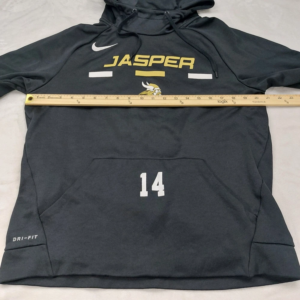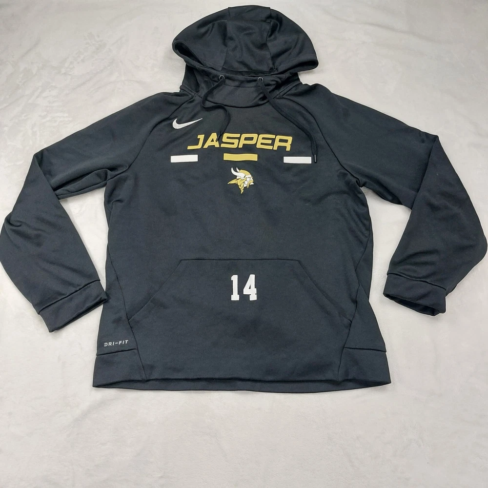 NIKE DRI-FIT MENS BLACK JASPER ALABAMA VIKINGS NUMBER 14 100% POLYESTER SIZE MEDIUM. LONG SLEEVE. POUCH POCKET. DRAWSTRING HOOD. MEASUREMENTS PROVIDED. Items ship from a pet friendly home. *Items ship from a smoke-free home. *Colors may vary due to lighting. *Please read descriptions. Any flaws will be noted and photographed. *I source my inventory from multiple sources. I can not speak on fit for items. I try to provide photos of measurements when possible to assist in fit. *Clothing items are laundered, inspected, and sealed in plastic bags after photos are taken. This ensures you receive the item in the condition it was photographed in. Due to this process, additional details and measurements can not be provided. *Reasonable offers considered. *If you have any questions, please ask. Buyer is responsible for reviewing all photos and descriptions for condition details. Although I do my best to find and disclose any flaws, there may still be flaws present that were missed unintentionally in human error.