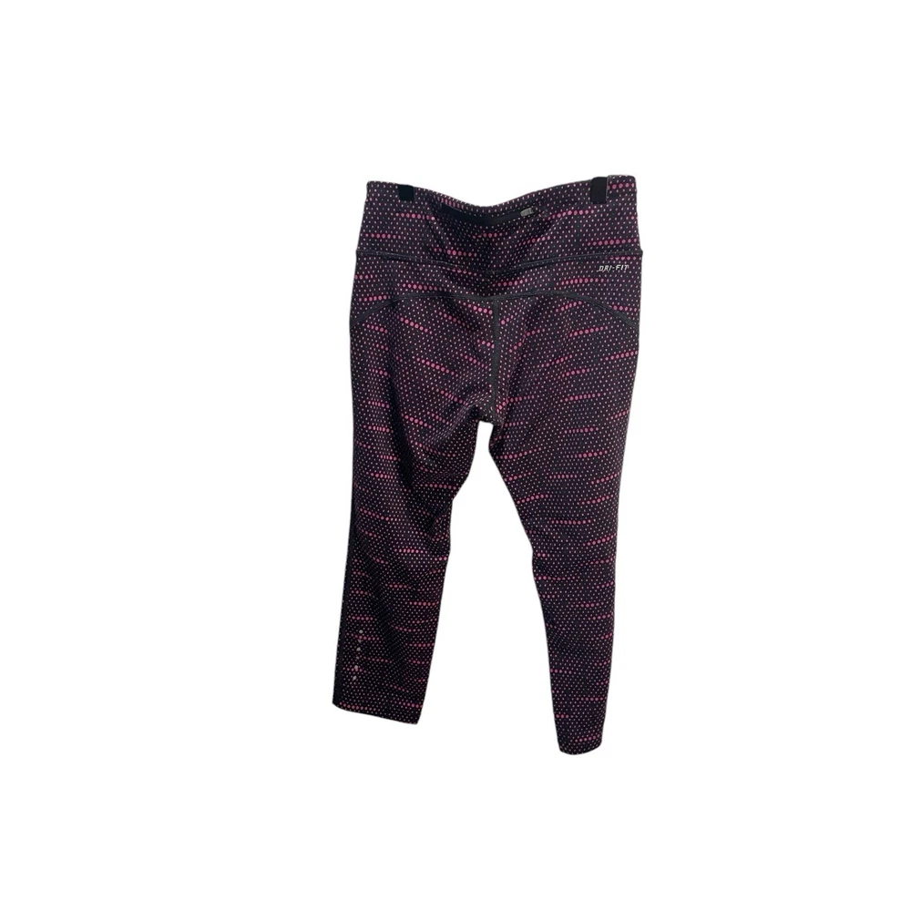 These Nike DRI-FIT Women's Capri Yoga Workout Pants in geometric pink and black are size XS with a waist size of 24 inches. Made of polyester, spandex, and cotton, these leggings feature an elastic waist and have a 21-inch inseam. Suitable for activewear occasions, they are machine washable and are ideal for activities like gym training, yoga, and dance in all seasons. in good condition inseam 21" rise 7" waist across 13" All Measurements Are Approximate Please email us with any questions! ** LIKE THE ITEM BUT NOT THE PRICE, REASONABLE OFFERS ACCEPTED