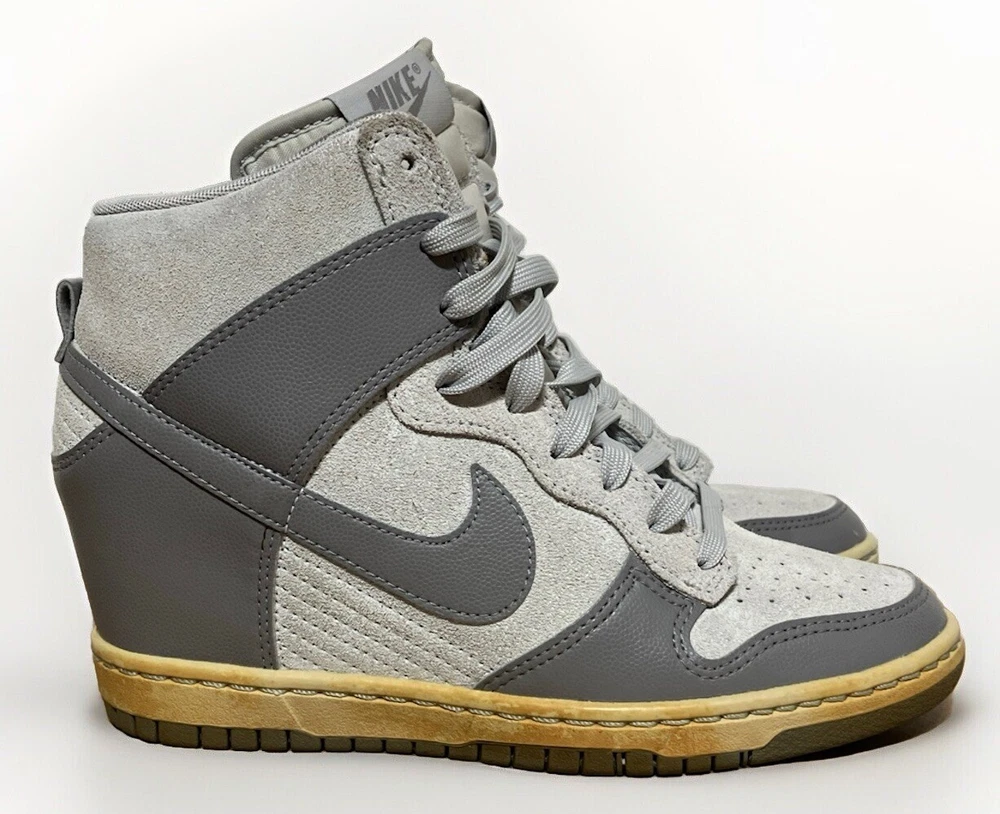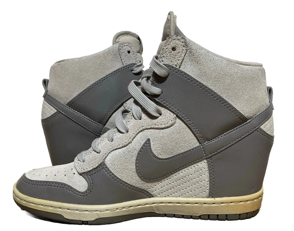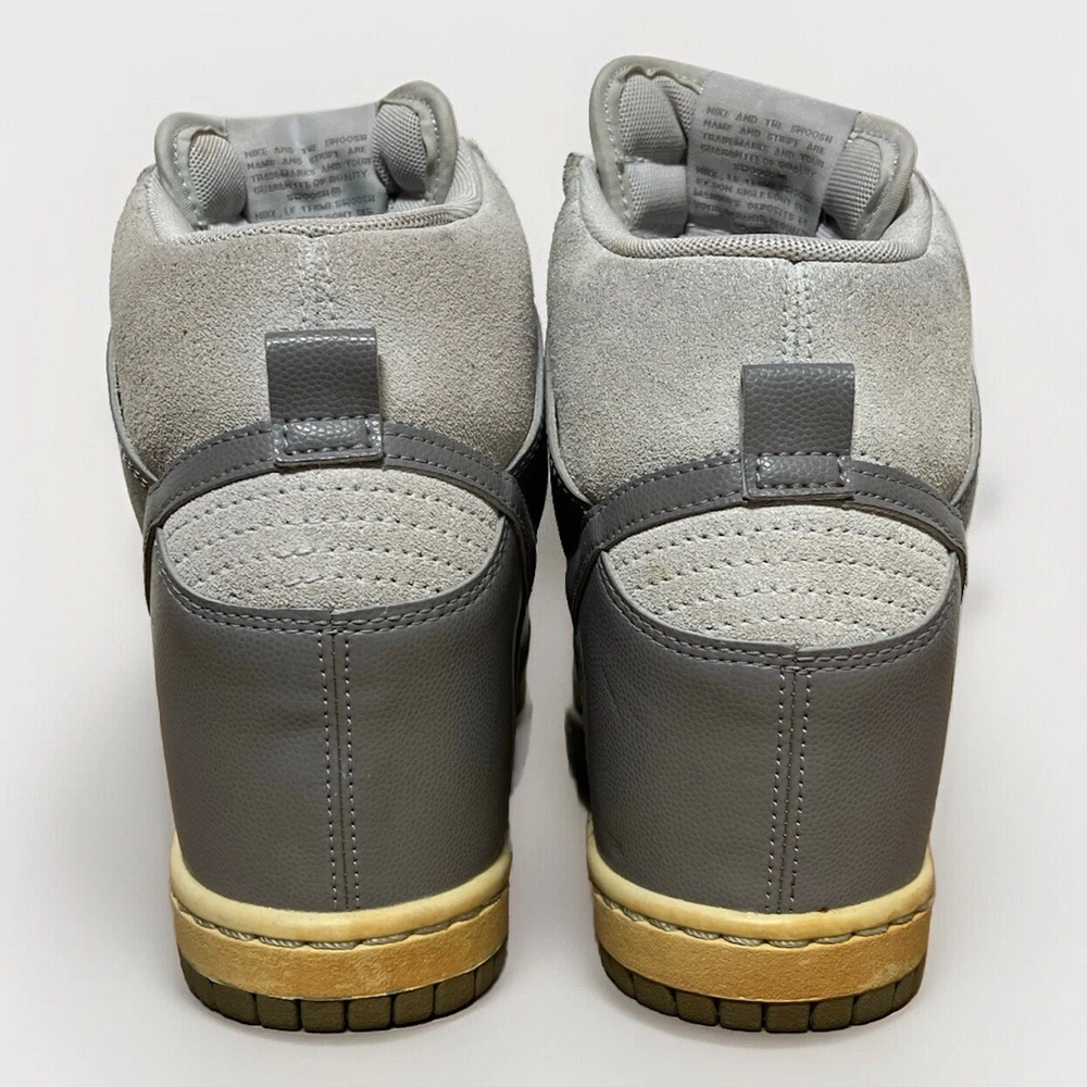 Shoes In Good Condition with some Stain as seen in the pictures… Elevate your sneaker game with these Nike Dunk Sky High Hidden Wedge Heel Cannon Gray Shoes. The lace-up closure ensures a secure fit while the rubber outsole provides excellent traction. These shoes feature a hidden wedge and hidden heel for added comfort and style. The gray color and solid pattern make these shoes versatile for any occasion, whether it's casual or athletic. The Nike logo accents and sky-high design add a touch of personality. These shoes are available in women's US size 7.5 and UK size 5, with an EU size of 38.5. Perfect for any season, these Nike Dunk Sky High shoes are a must-have for any sneakerhead.