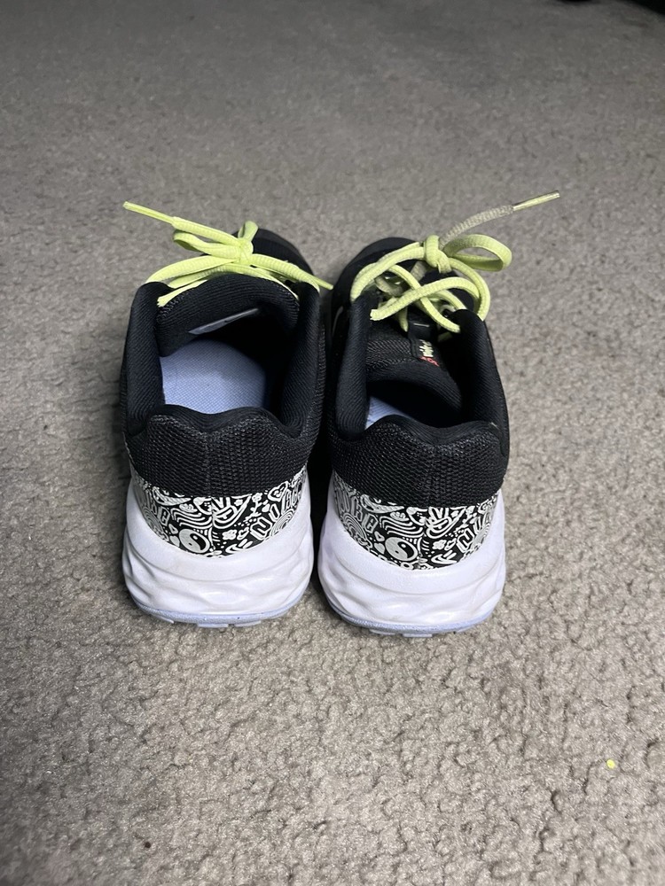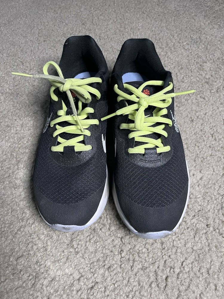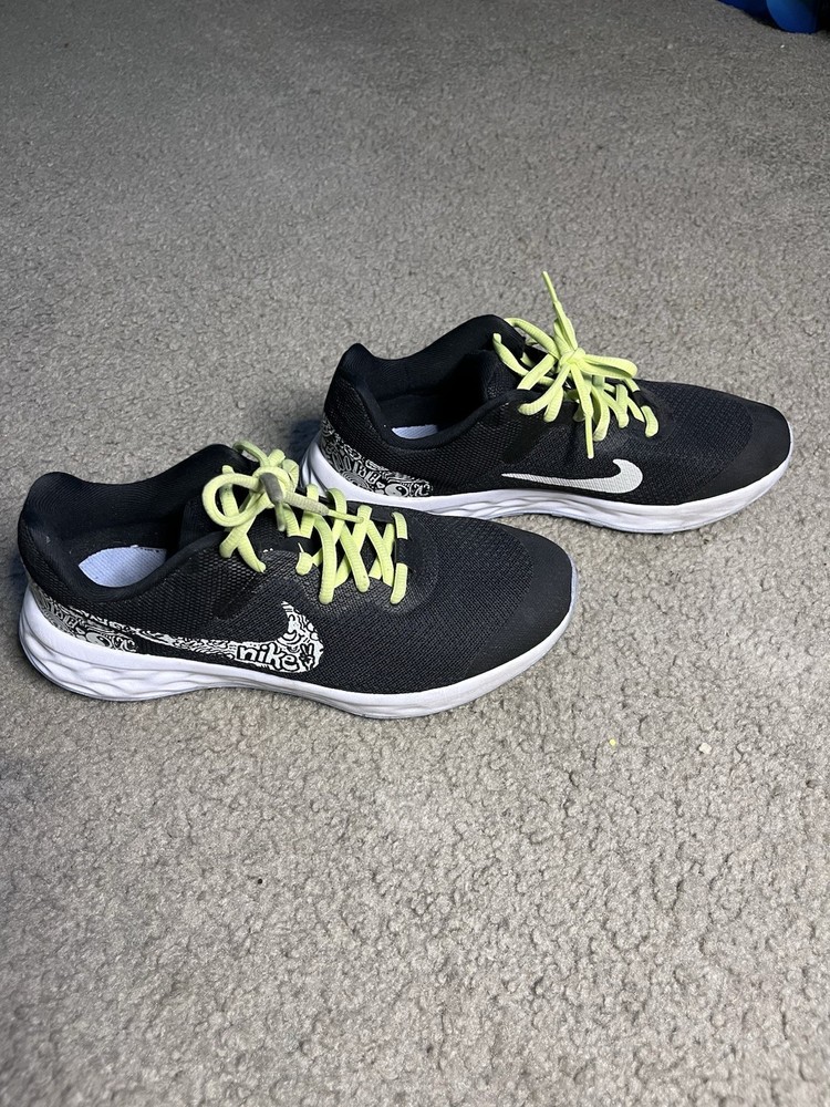The product is a pair of NIKE Revolution 6 athletic sneakers in size 5.5Y (UK 5, EU 39). These low-top shoes feature a standard lace-up closure and are made with synthetic upper material in a sleek black color. Designed for unisex kids, the Nike Revolution 6 sneakers are part of the popular Nike Revolution product line known for their comfort and performance. Perfect for both sports activities and everyday wear, these brand new shoes offer quality and style for young athletes.