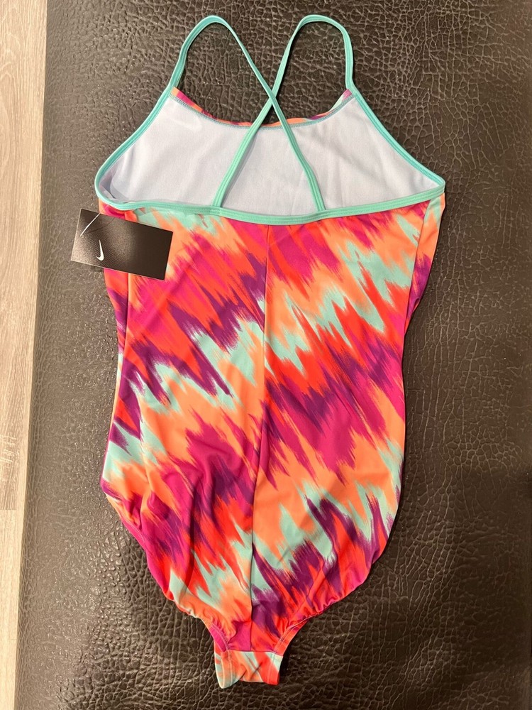 Dive into summer with this stylish Nike Girls Racerback OnePiece Swimsuit in a trendy pink tie-dye pattern. Perfect for a day at the beach or lounging by the pool, this swimsuit is made for girls and offers comfort and style. The M size is perfect for a young girl and will fit her perfectly. The Nike brand ensures quality and durability, making this swimsuit a great addition to any summer wardrobe. Get ready to make a splash in this colorful swimsuit!