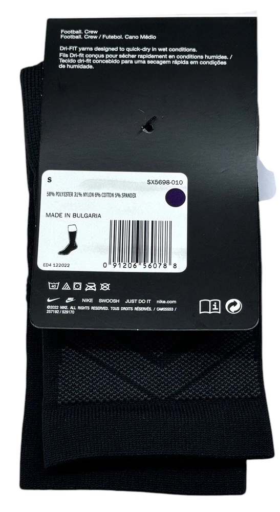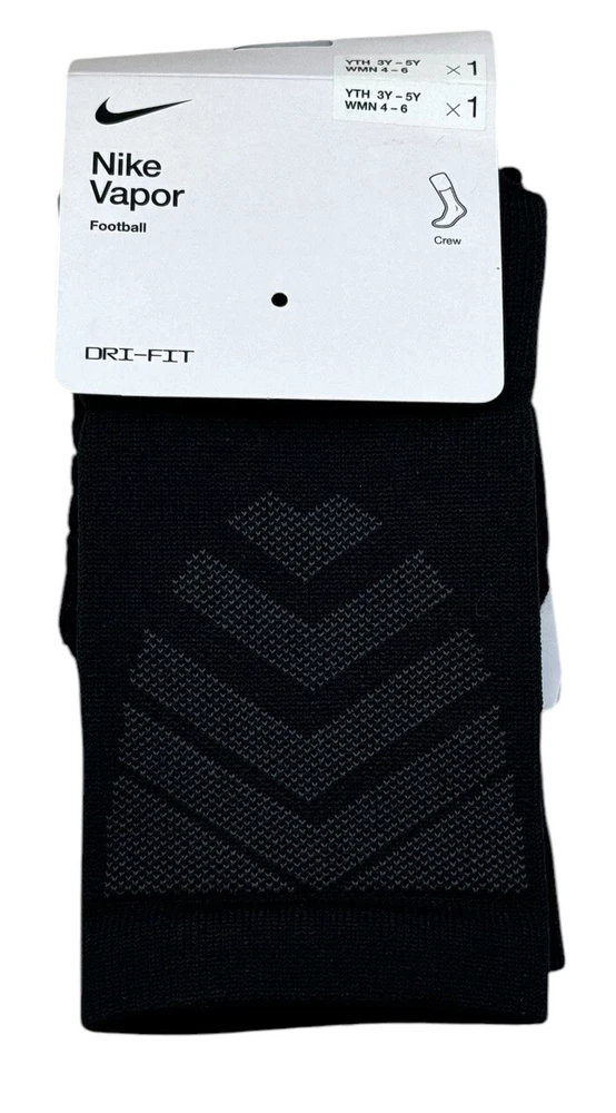 NIKE VAPOR Football Crew Socks SX5698 Black White Sz S Unisex YTH 3Y-5Y WMN 4-6 NEW In Pack!!! Please See All Pictures. NIKE VAPOR 1-Pair Football Dri-Fit Crew Socks SIZE Available: SMALL YTH MEN’S US Shoe Fit Size Available: 3Y-5Y WOMEN’S US Shoe Fit Size Available : 4-6 PATTERN: Striped COLOR : Black/White RETAIL PRICE: $18.00 + Tax Description: 31% Nylon, 58% Polyester 5% Spandex 6% Cotton Machine Wash Cold Imported