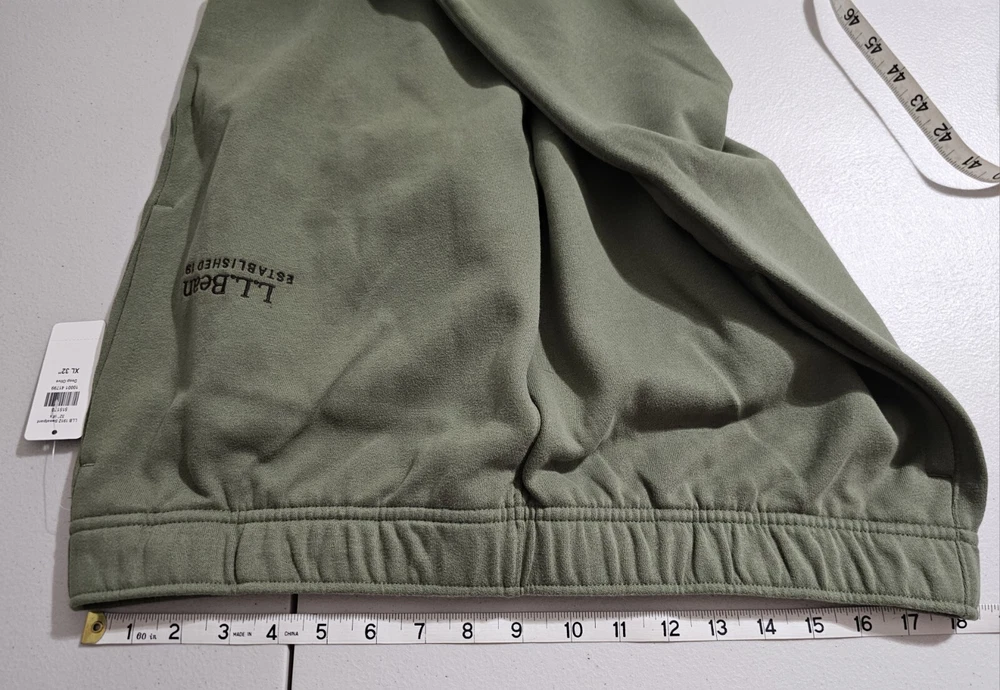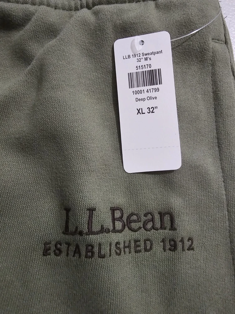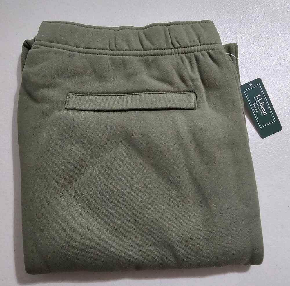 If you especially want something comfortable to wear, these are it. They are so soft! Men's LL Bean XL Deep Olive sweatpants with side pockets and elastic with drawstring waist. The legs are just straight at the bottom, with no zipper or elastic. 60% Cotton 40% polyester New in package. I removed it from the package to measure and take pictures. Measurements: Waist : 36" Inseam: 32" Measured lying flat. Waist is elastic with drawstring, so it can accommodate a little range in sizing. Returns accepted within 30 days in same condition as purchased. Buyer pays return shipping. Shipping: I'm packing this tightly in a Priority Mail to save on shipping.