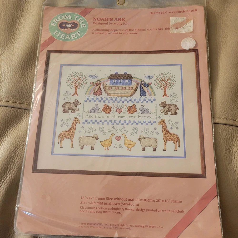Embark on a charming journey through craft with the vintage Dimensions Stamped Cross Stitch Noah's Ark Kit #53018. This classic kit invites you to create a delightful 16 x 12" piece that captures the essence of a timeless tale. Included are all the essentials: cotton embroidery thread, a white sailcloth, a needle, and detailed instructions to guide you through each stitch. Dimensions has been revered for its quality and this kit is no exception, offering a beautiful expression of creativity and nostalgia. Whether you're an experienced crafter or new to the world of needlework, this kit promises a rewarding project with a thematic appeal that spans generations.