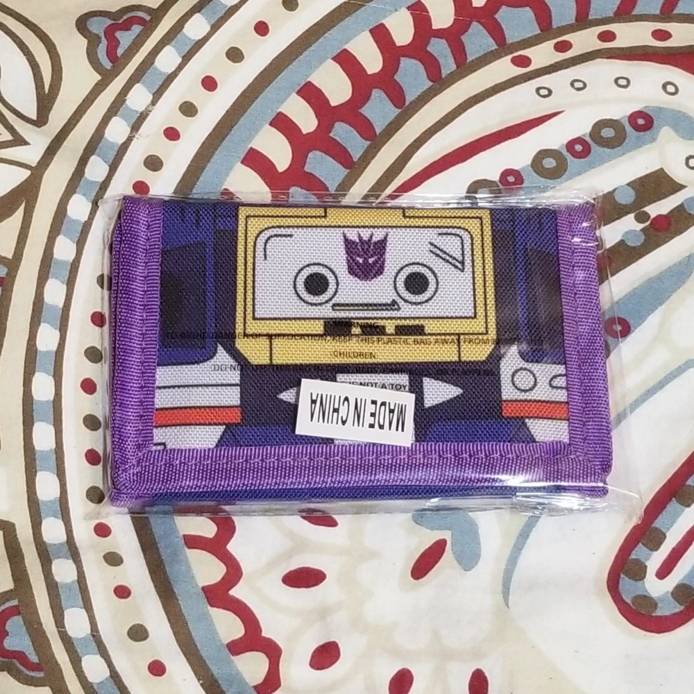 Brand new purple, dark blue/indigo, yellow, light gray, and red Transformers Decepticon Soundwave cassette tape-inspired trifold billfold/wallet.