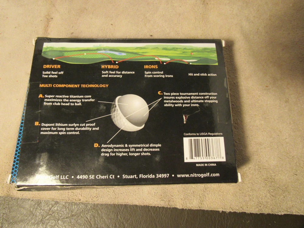 Model:NITRO ULTIMATE DISTANCEUPC:847755003678MPN:NUD12BXWBall Type:casual or tournamentNumber in Pack:12Features:DistanceCountry/Region of Manufacture:ChinaSport/Activity:Golfgtin13:847755003678Brand:NitroColor:WhiteNumber of Items in Set:12