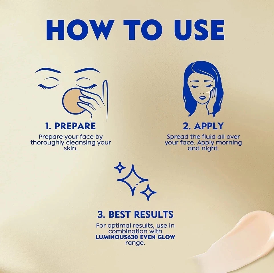 NIVEA LUMINOUS 630 EVEN GLOW Anti Dark Spot Face Fluid SPF 50, UVA & UVB Sun Protection, Spotless Even Skin, Hydrating Hyaluronic Acid & Vitamin E, 40ml Free Shipping World Wide About this item Enriched With Patented Luminous630 Ingredient, Hyaluronic Acid, Vitamin E And Spf50 Acts On Existing Pigmentation To Lighten Dark Spots And Reduce Their Size Balances New Melanin Production To Prevent The Appearance Of New Spots For Even & Luminous Skin, With A Lightweight Texture Suitable For Pregnant Women, Gentle To The Skin And Recommended For All Skin Types Including Sensitive Skin Apply Morning On Cleansed Face A Max. Of 4 Times A Day After The Luminous630 Serum Shipping All item will be shipped directly from MALAYSIA ü Registered Post Item delivered will required signatures at the time of receiving. ü Dispatched items tracking number will be updated within 24 hrs. Of the dispatch. ü All items ordered will be dispatched within 48 hour after receiving the clear payment. ü All items require 15 to 30 business days to arrive at the given address. ü Please do not order if you are not willing to wait for above given time. ü All our items will be shipped worldwide, In any case the item is been stuck to the buyers custom department the buyer has to pay the custom charges for the receiving of the item. ü If you need express delivery we can arrange by DHL, Aramex, Fedex & UPS delivery time period 3-5 working days for more details please contact us through eBay message. *condition apply*