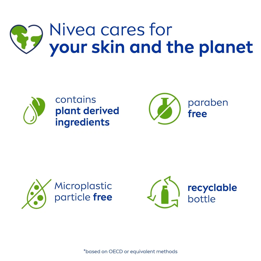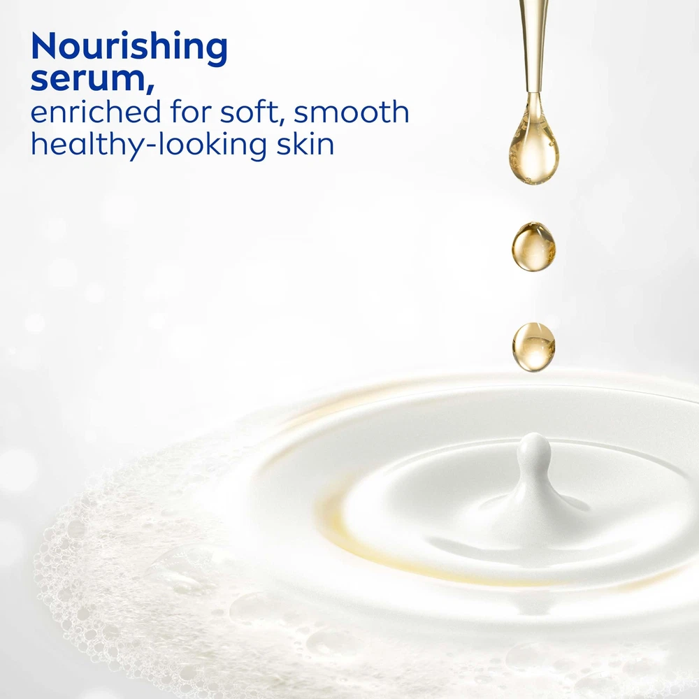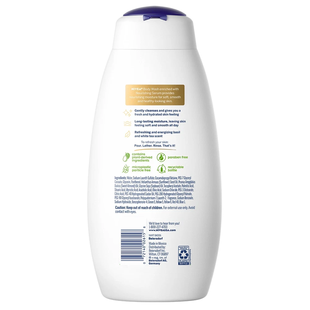 Features: Energizing Scent: Basil and white tea scented body wash fills your shower with a refreshing and energizing aroma Gently Cleanses: This dry skin body wash with Nourishing Serum is enriched with a unique blend of plant-derived oils, essential skin lipids and vitamins that work together to gently cleanse your skin Long Lasting Moisture: NIVEA Basil and White Tea Body Wash leaves skin feeling soft and smooth all day Use for Shaving: The creamy lather of this hydrating body wash is also a great alternative to shaving soap or shaving cream Includes one (1) 20 fluid ounce bottle of NIVEA Basil and White Tea Body Wash with Nourishing Serum Details: NIVEA Basil and White Tea Body Wash with Nourishing Serum provides nourishing moisture for soft, smooth and healthy-looking skin. This moisturizing body wash for dry skin is enriched with a unique blend of plant-derived oils, essential skin lipids and vitamins that work together to gently cleanse your skin. NIVEA Basil and White Tea scented body wash fills your shower with the refreshing and energizing aroma of fresh cut basil leaves combined with white tea, and leaves skin feeling soft and smooth all day. The creamy lather leaves skin amazingly soft and refreshed, and this shower gel can also be used as an alternative to shaving cream. NIVEA Basil and White Tea Body Wash is ideal for everyday use, and is a paraben free body wash formulated without microplastic particles. NIVEA body wash is a key part of a skincare routine and pairs well with NIVEA Body Lotion as part of a daily skin care regimen. To use NIVEA Basil and White Tea Body Wash, massage the creamy lather onto your body with a cleansing pouf and rinse. NIVEA is a trusted leader in the field of skin care products, with more than 130 years of expertise.