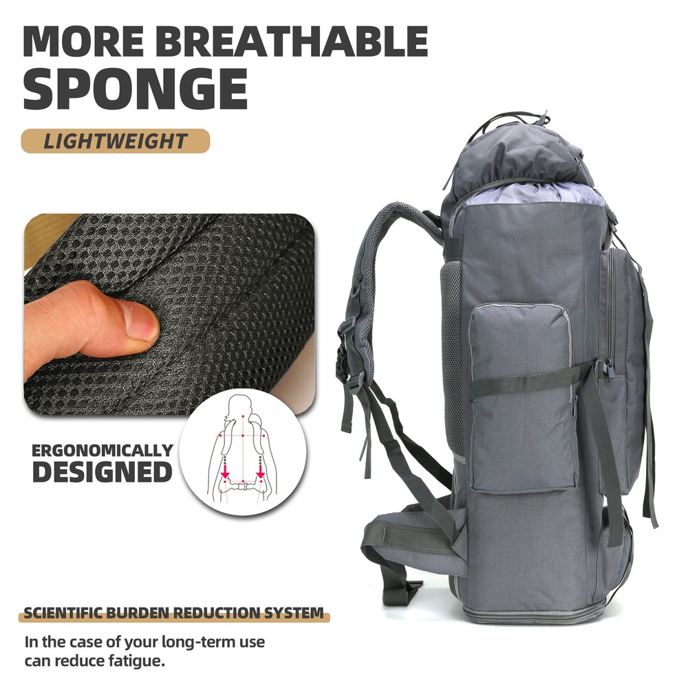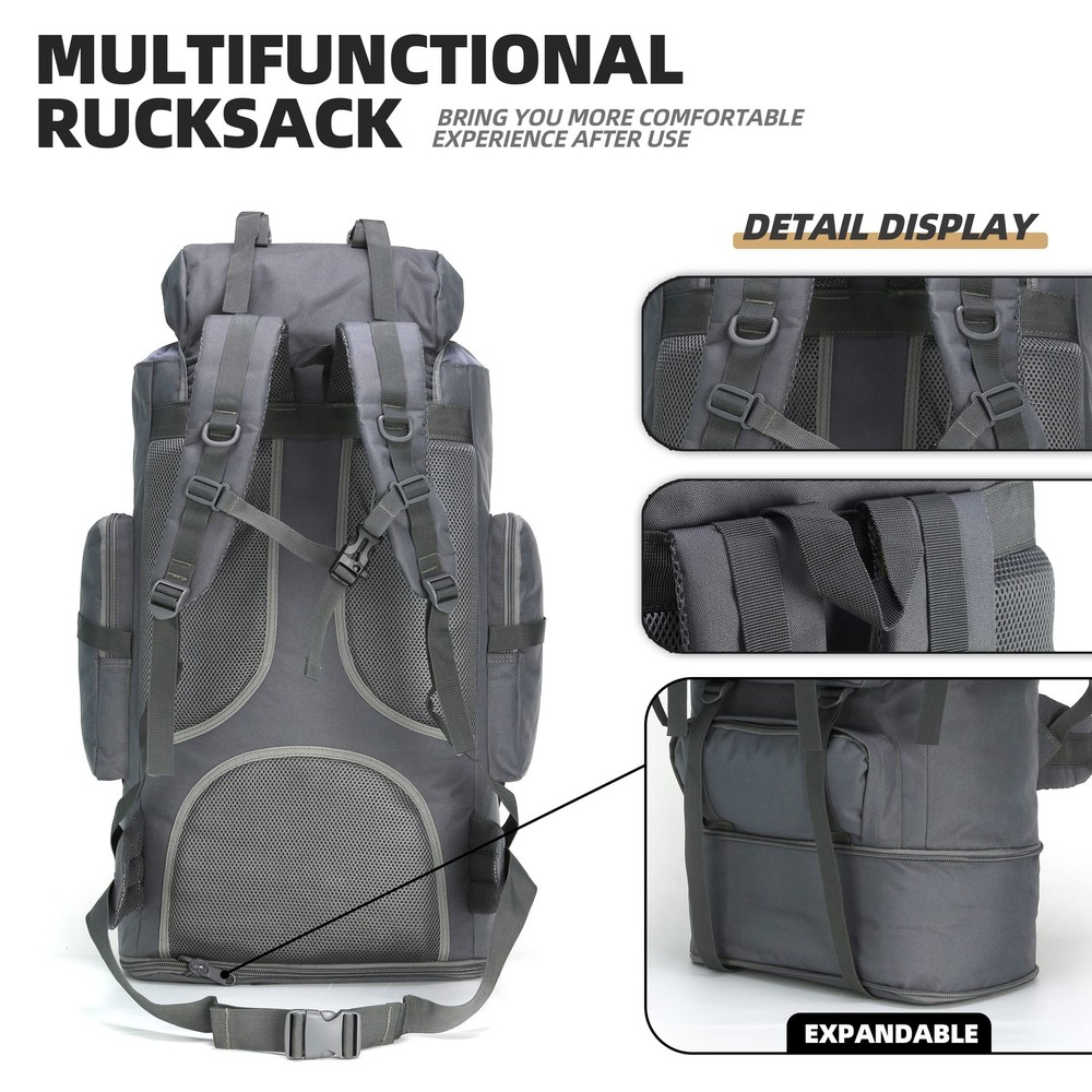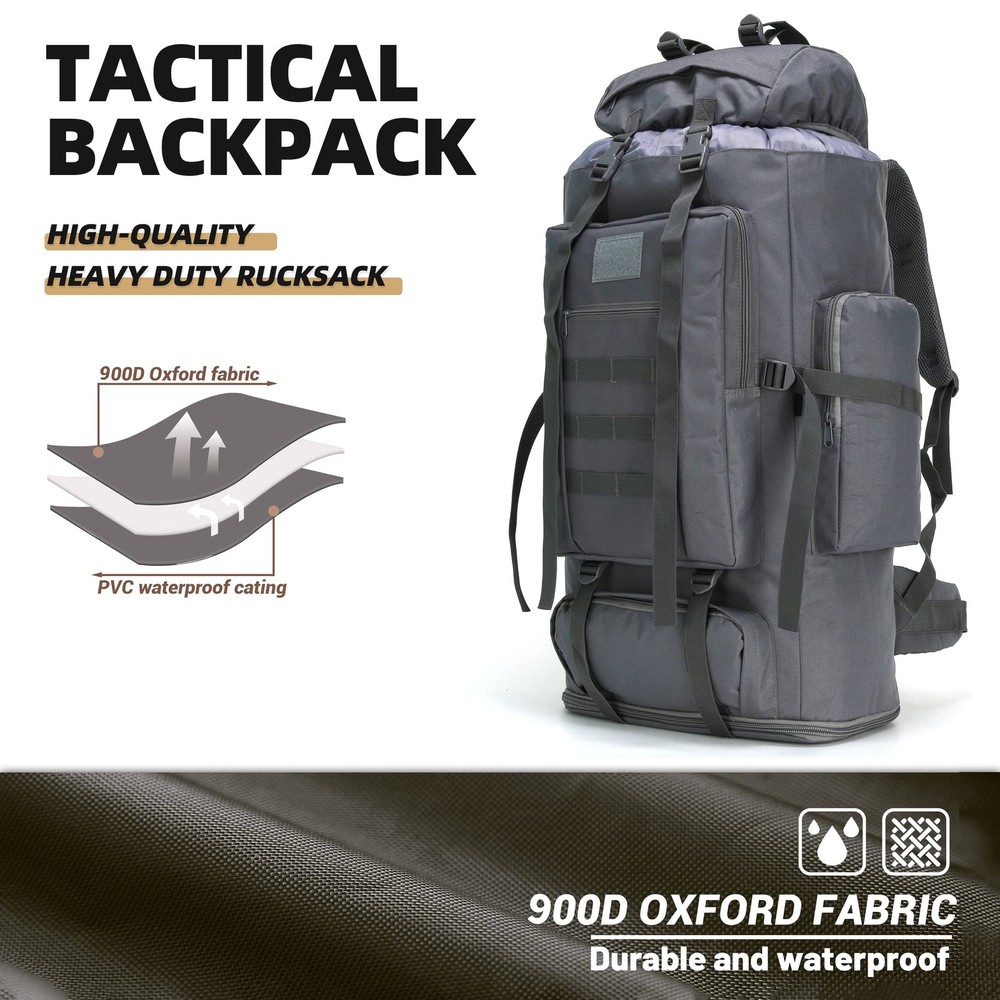 HIking Backpack: This backpack is made of 900D nylon fabric, waterproof and tear-resistant, which can protect your items from bad weather and environment, allowing you to enjoy outdoor life with peace of mind. Training Backpack: This backpack has many practical functions, and it has strong durability and stability. The backpack for men features strong zippers and buttons to prevent your equipment from slipping out of the pack or being damaged, won't easily break or become messy in use. Large Capacity Backpack: This 100L hiking backpacks has multiple practical functions such as multiple pockets and compartments, which are convenient for organizing and storing various equipment. This camping backpack is a reliable, high-capacity bag for a variety of outdoor activities and adventures and will meet all your needs. Adjustable Straps Pack: The backpack is equipped with shoulder straps , waist belt, chest strap. They are all adjustable which can spread the load and reduce the pressure on the back. Molle backpack has a back ventilation system to keep you dry and cool during long days of use. Multifunctional Bag: This fitness daypack is very versatile and suitable for various outdoor sports. For example: hiking pack, travel backpack, sports bag, tactical bag, camping backpack, cycling daypack.